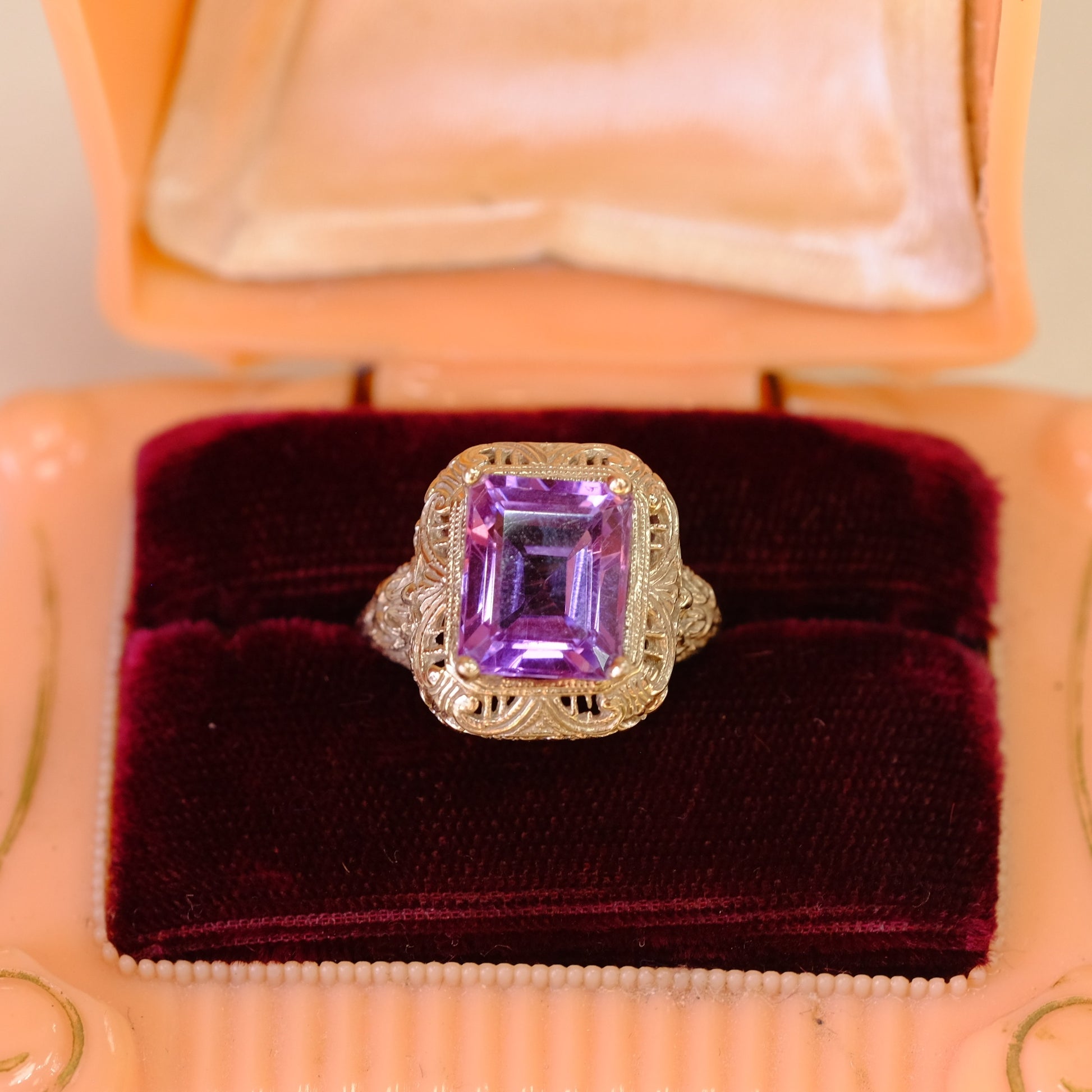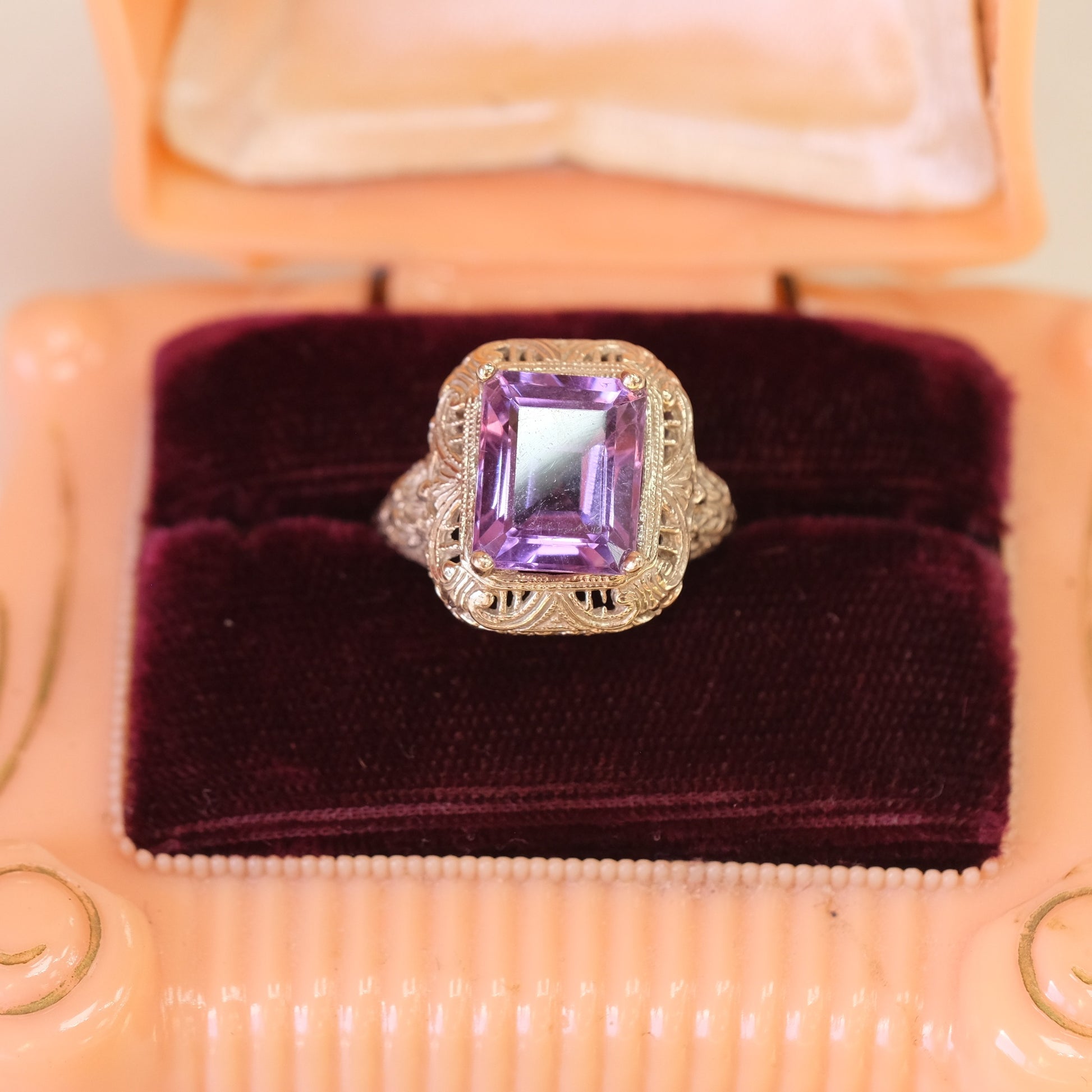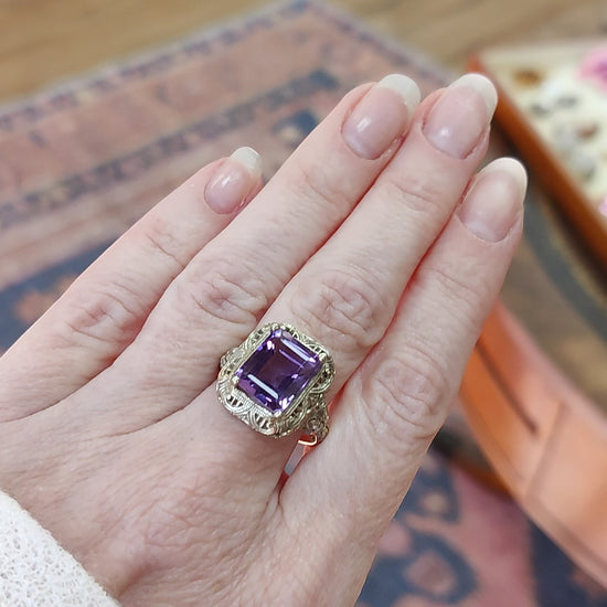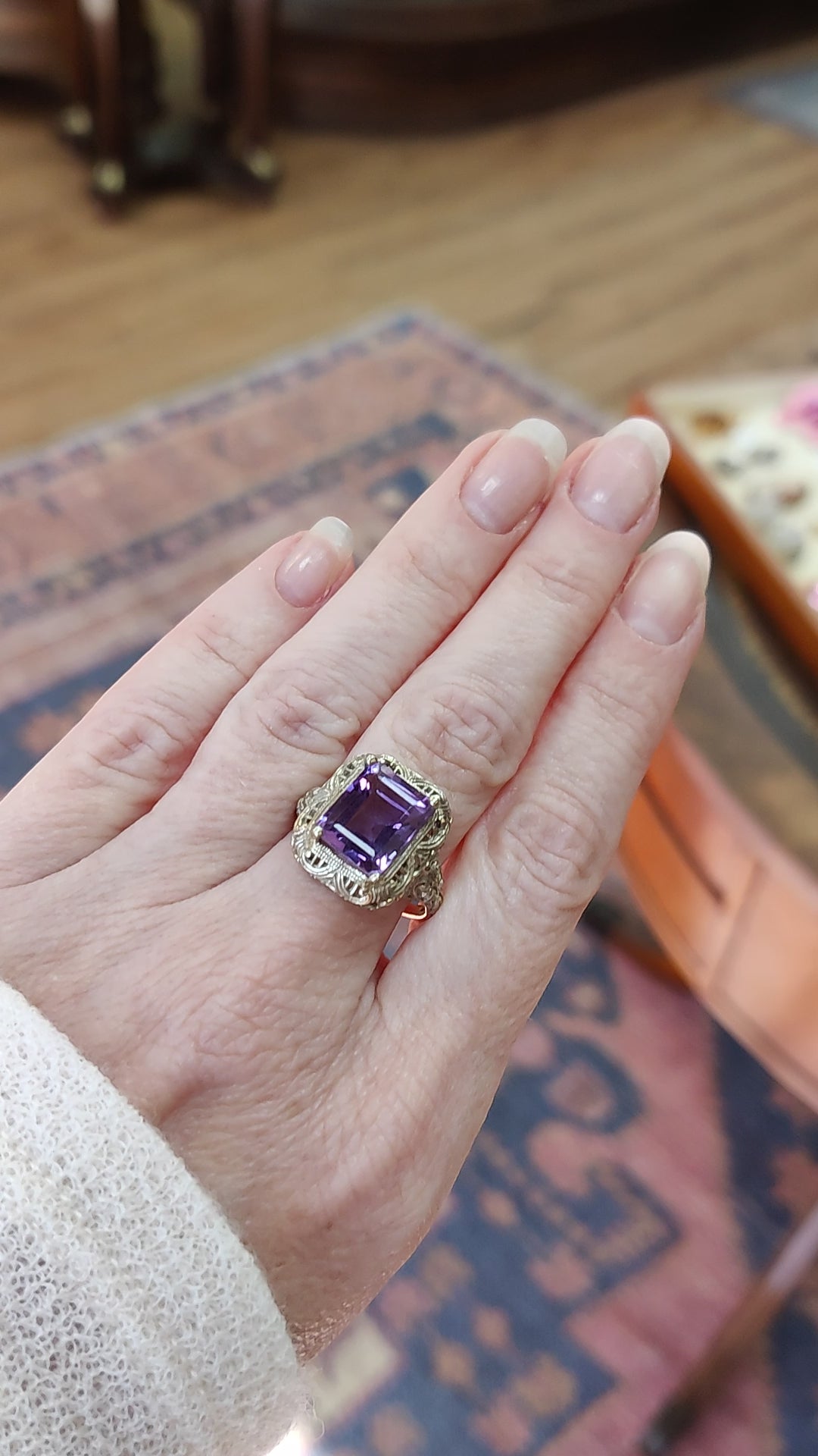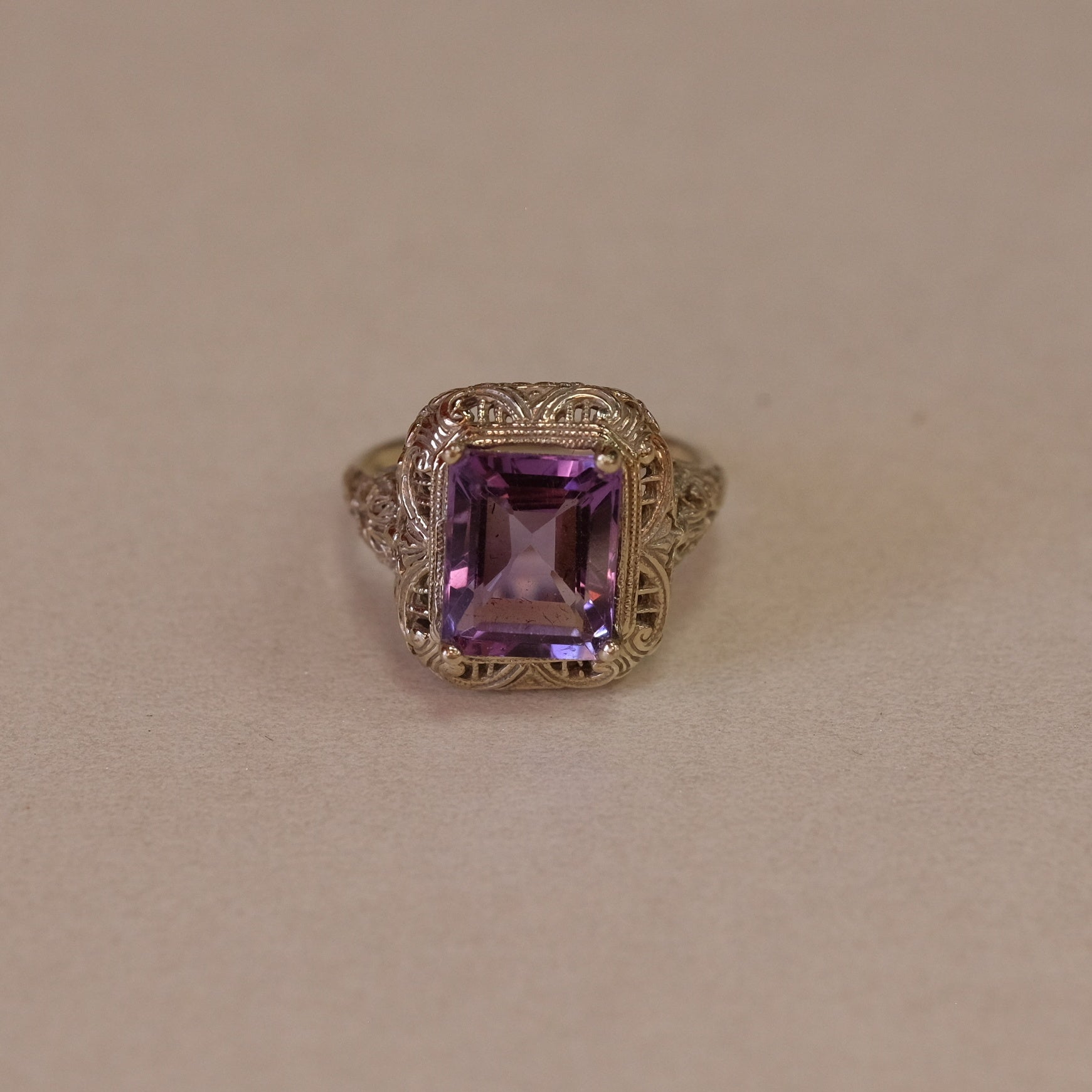 This elegant 14k white gold ring features a stunning amethyst stone set within intricate filigree detailing. The delicate metalwork showcases traditional craftsmanship, creating a sophisticated vintage-inspired design. The rich purple amethyst provides a striking focal point against the lustrous white gold band. Perfect for everyday wear or special occasions, this ring combines timeless elegance with fine jewelry quality.