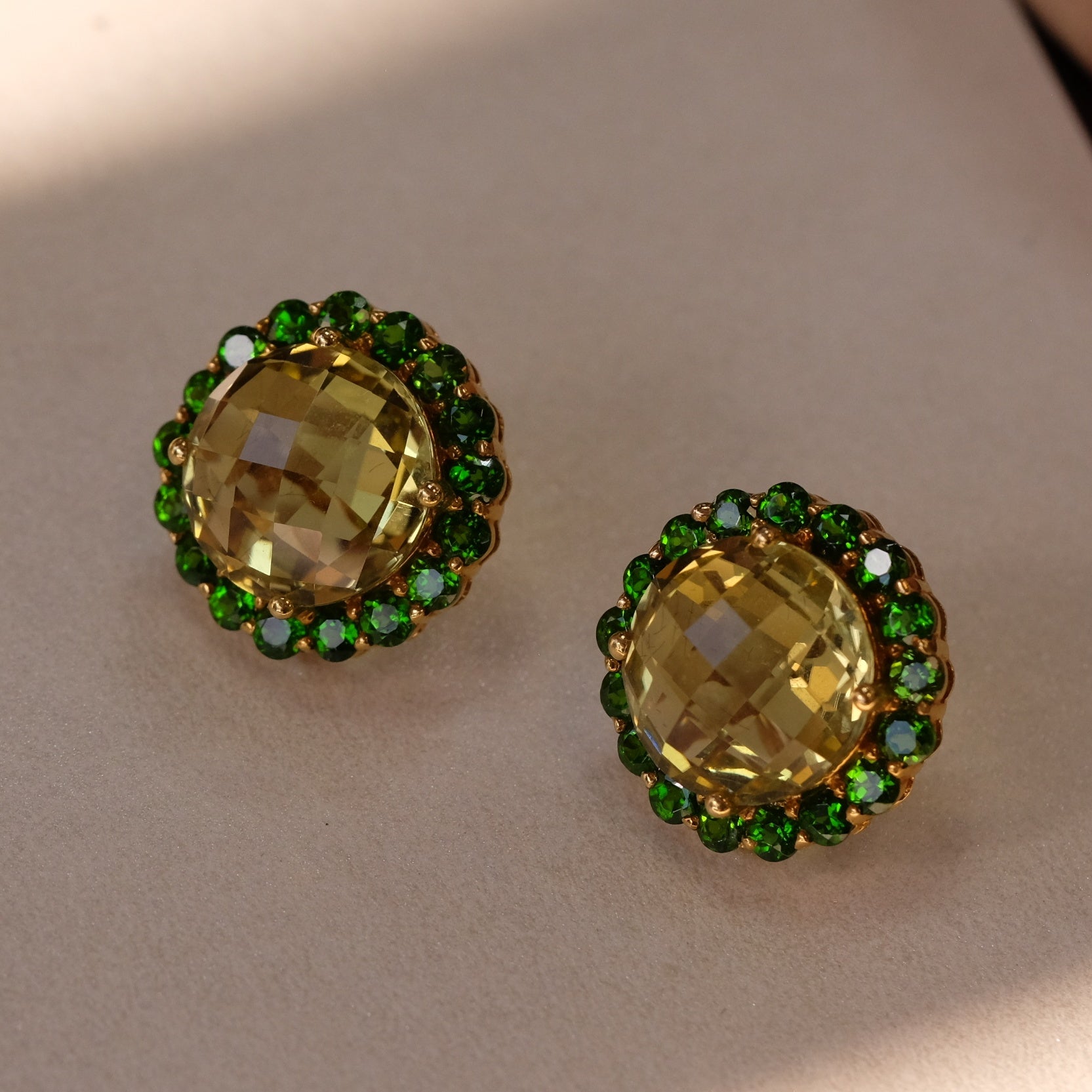 These 18K gold earrings feature vibrant citrine gemstones paired with rich green tsavorites, creating a balanced and elegant look. The combination of warm gold and contrasting gemstones offers a refined accessory suitable for both everyday wear and special occasions. Designed to add a subtle touch of color and sophistication to any outfit.