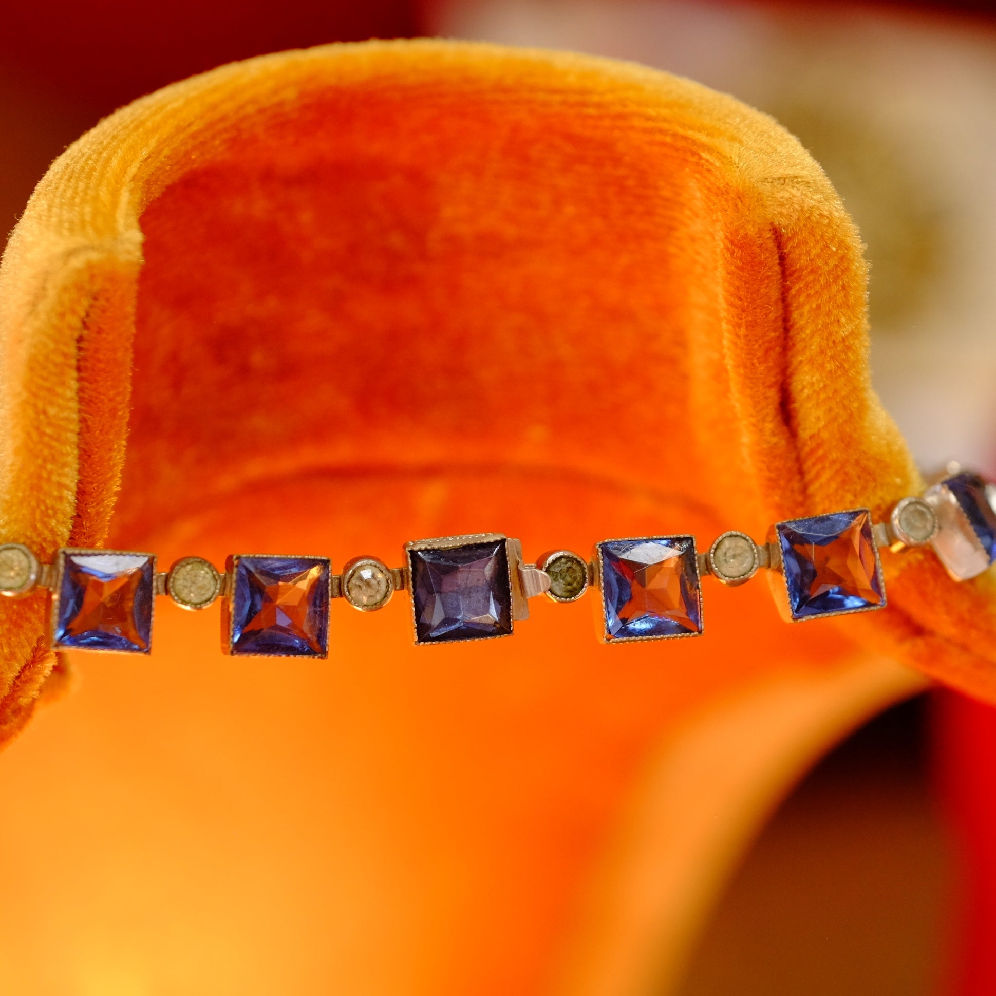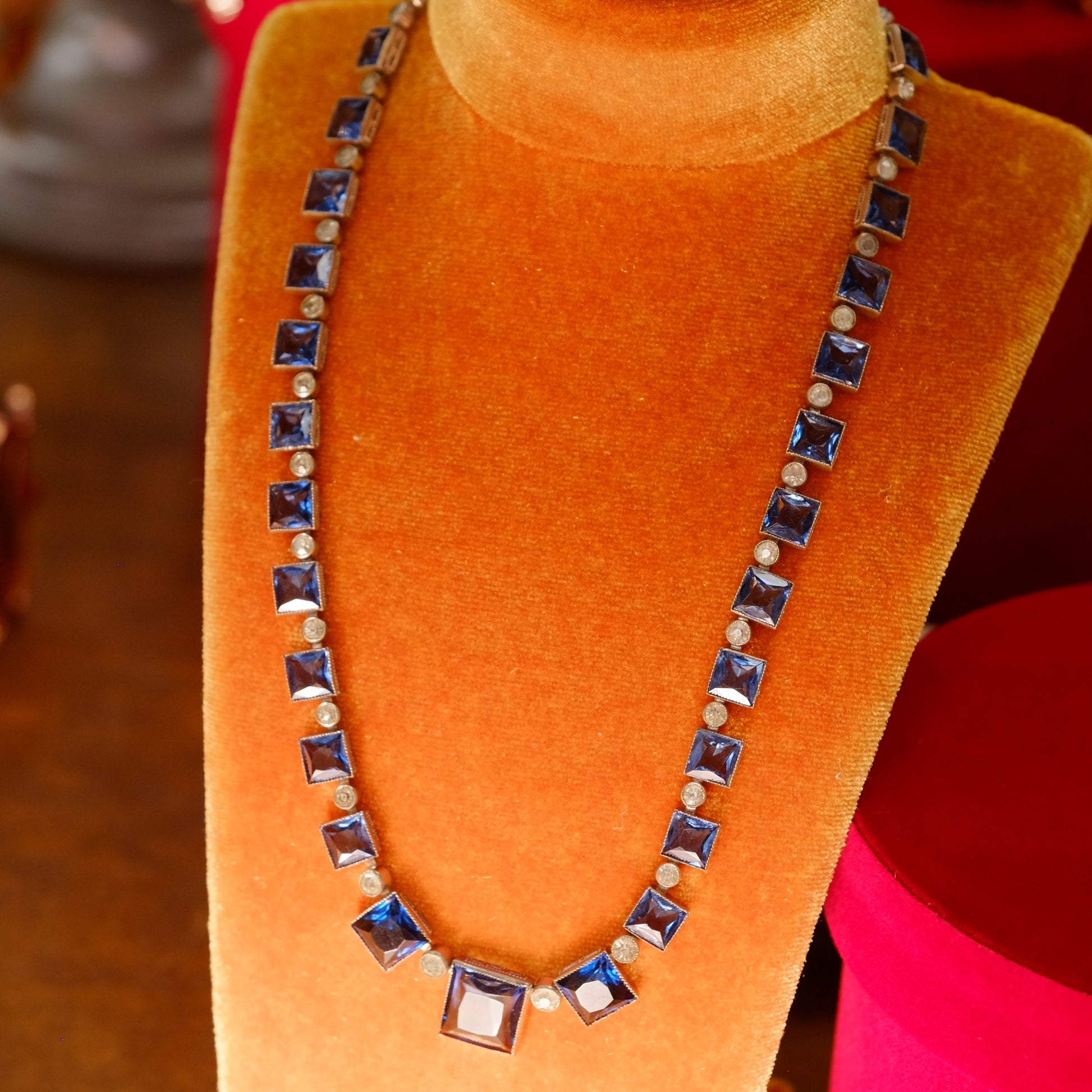 This stunning 1920s Czech necklace features vibrant blue paste stones set in a classic design characteristic of the Art Deco era. Czech paste jewelry from this period is highly prized by collectors for its brilliant sparkle and craftsmanship. The necklace showcases the quality and artistry that made Czech costume jewelry renowned throughout the early twentieth century. A timeless piece that adds vintage elegance to any collection or outfit.