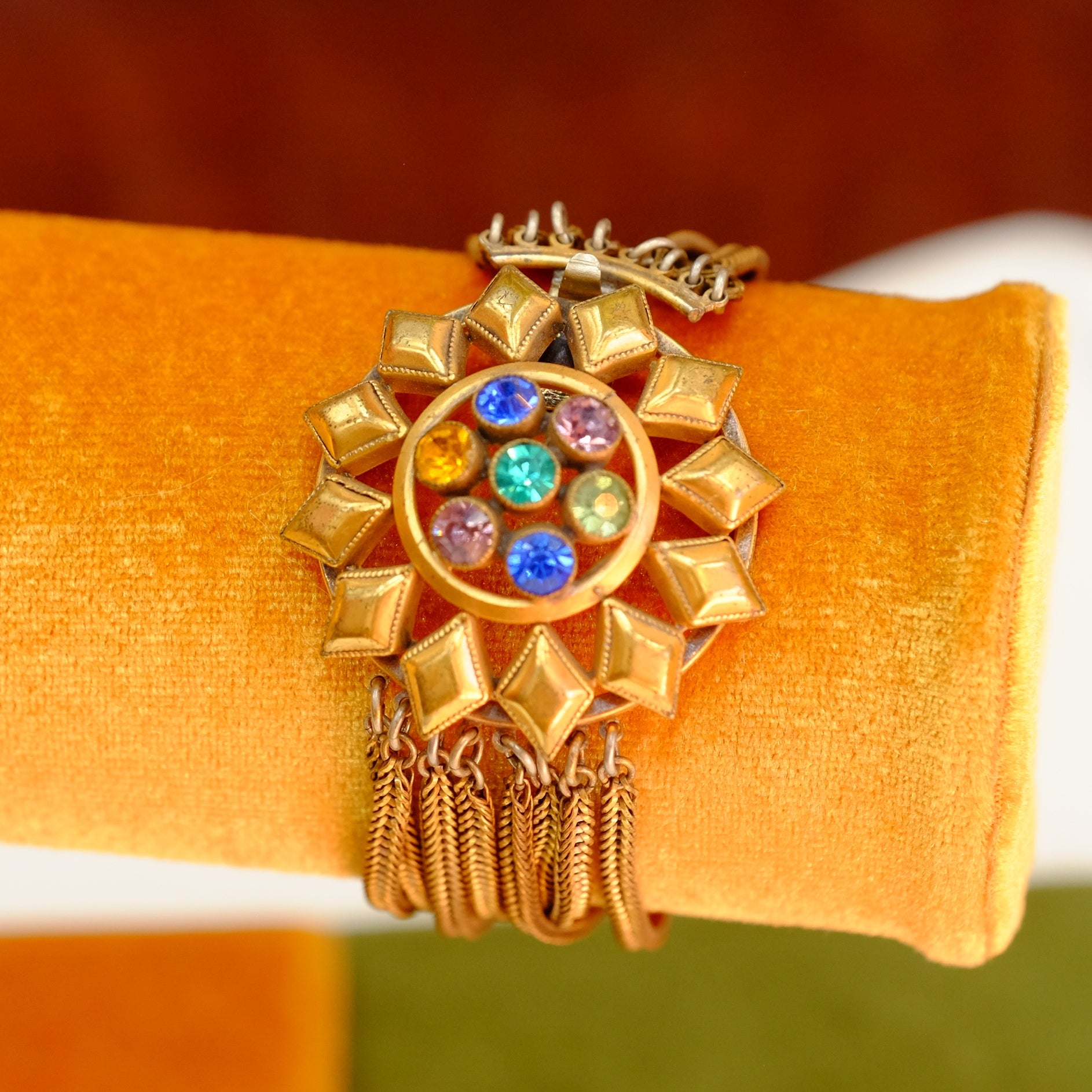 This delicate bracelet from the 1910s combines vintage charm with understated elegance. Featuring a refined chain design paired with soft pastel star accents, it captures the aesthetic sensibility of the Edwardian era. The piece showcases the craftsmanship typical of early 20th-century jewelry, with its gentle color palette and detailed metalwork. A distinctive accessory for collectors of period jewelry or anyone drawn to the romantic style of the 1910s.