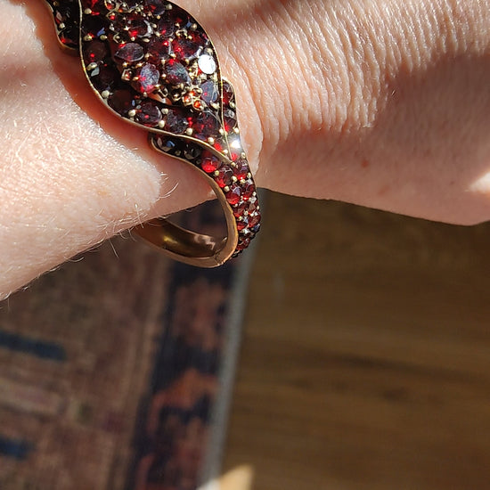 This exquisite Victorian-era bracelet showcases deep crimson garnets set in ornate metalwork characteristic of the period. The rich gemstones display the warm, jewel-like quality that made garnets a favored choice among Victorian jewelry designers. The bracelet features intricate detailing and secure settings that have endured for generations. A timeless piece that captures the elegance and craftsmanship of 19th-century jewelry design, perfect for collectors or those seeking authentic vintage accessories with historical significance.