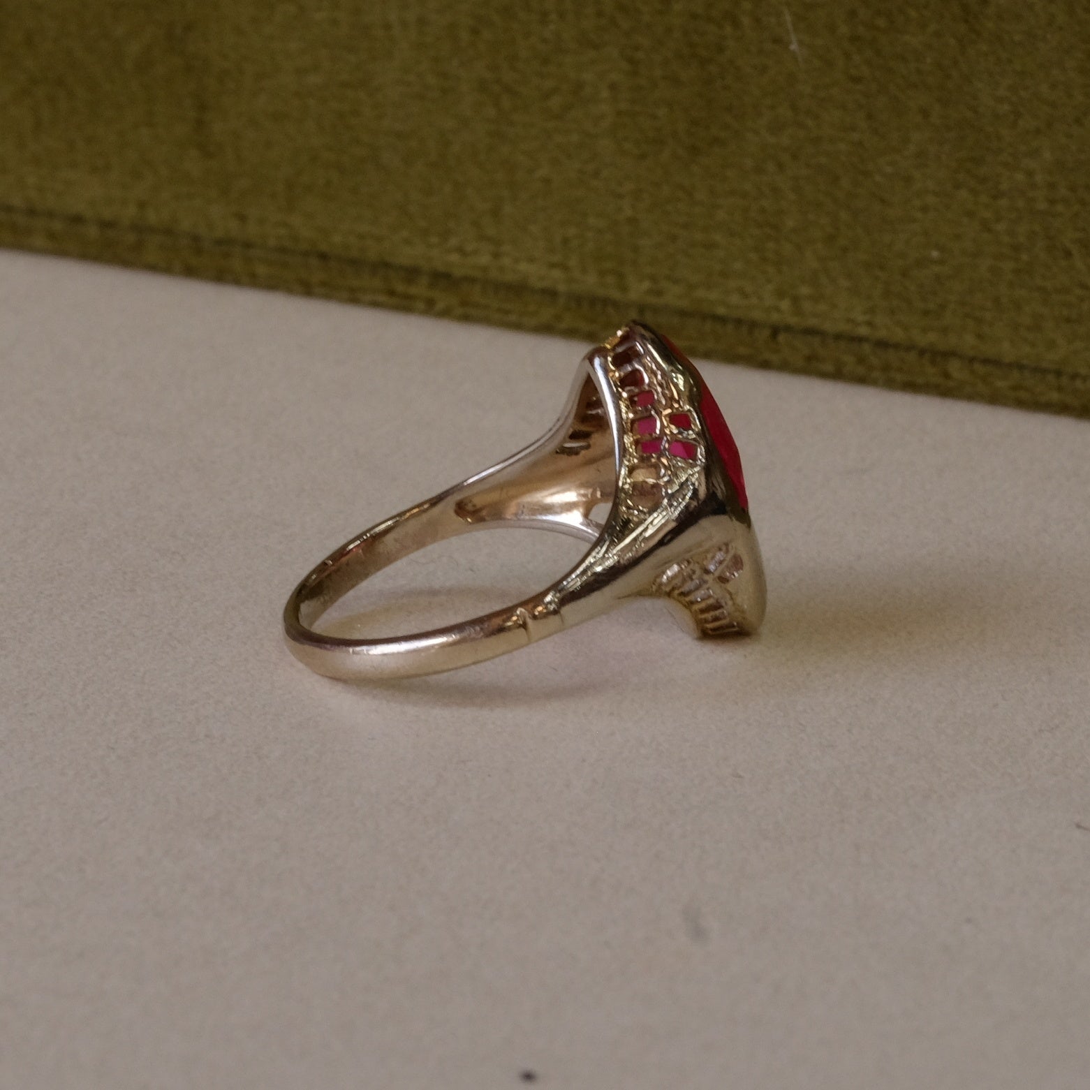 This Art Deco piece features 14k gold elegantly paired with brilliant diamonds and vibrant rubies. Its timeless design highlights the fine craftsmanship of the era, making it a sophisticated addition to any jewelry collection. Perfect for those who appreciate classic style with a touch of luxury.