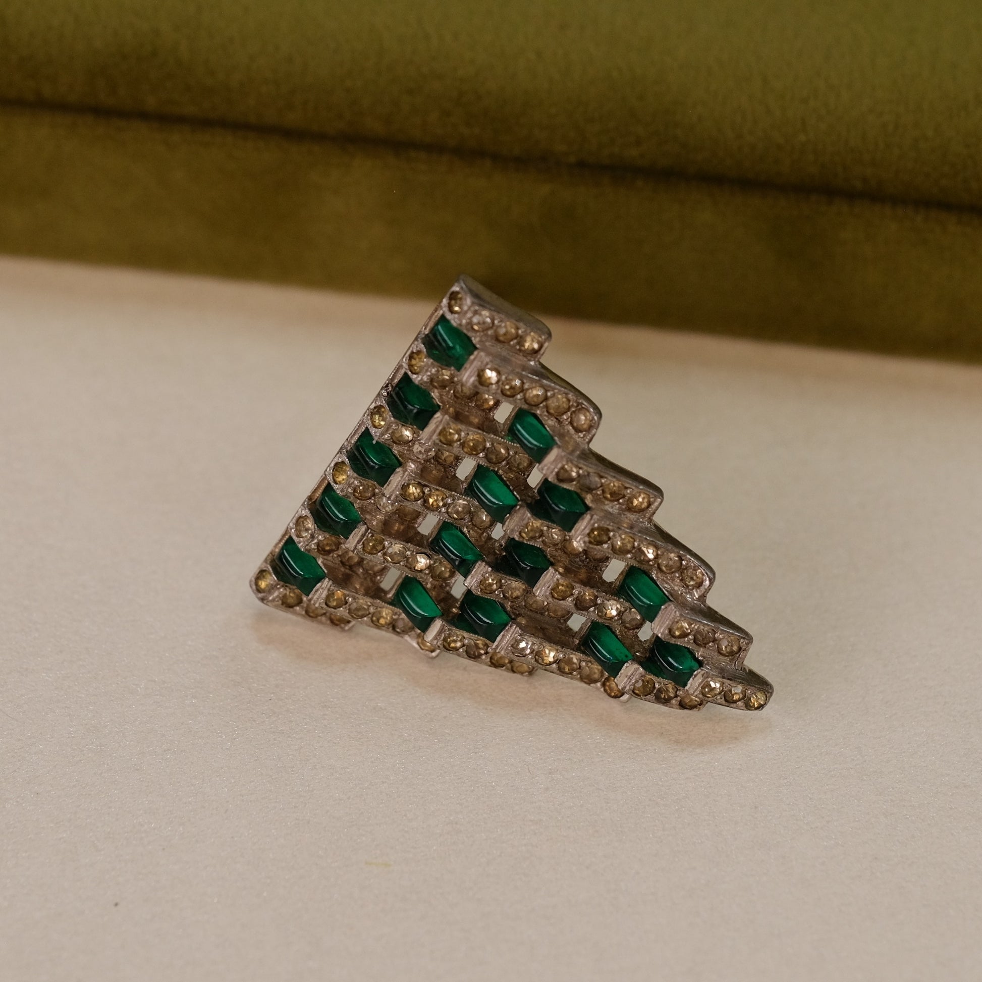 Art Deco Green Dress Clip This vintage dress clip exemplifies the geometric elegance of the Art Deco era. Crafted with a striking green finish, the clip features the period's signature angular lines and streamlined design. Perfect for collectors of 1920s-1930s accessories or anyone seeking to add authentic vintage flair to their wardrobe. The clip's compact size makes it ideal for securing fabric on dresses, blouses, or scarves with timeless style.