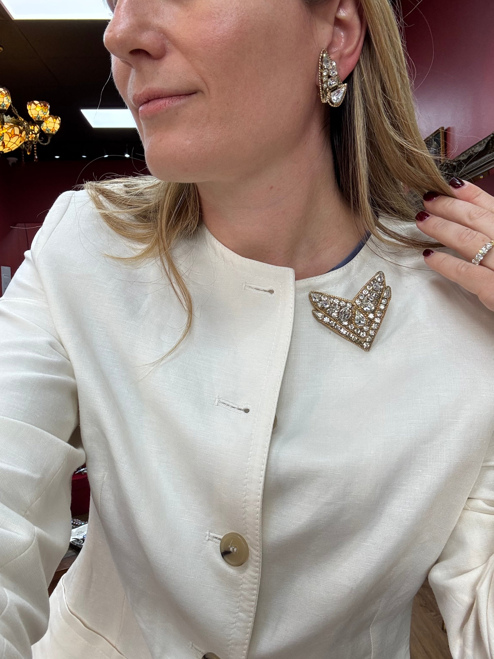 This elegant pin and earrings set from the 1950s Castlecliff collection showcases classic mid-century design. The timeless pieces offer a subtle vintage charm, perfect for adding a refined touch to any outfit. Ideal for collectors or those seeking distinctive antique jewelry.