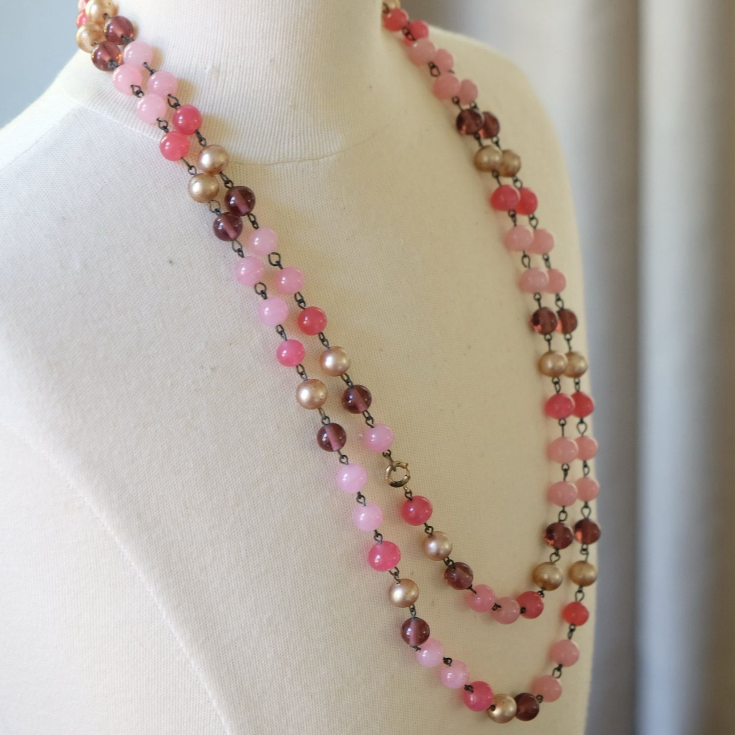 This Early Pink and Cranberry Glass Necklace features delicate glass beads in soft pink and rich cranberry hues. Its timeless design offers a subtle pop of color, making it an elegant accessory for both casual and formal occasions. Lightweight and comfortable, this necklace adds a touch of vintage charm to any outfit.