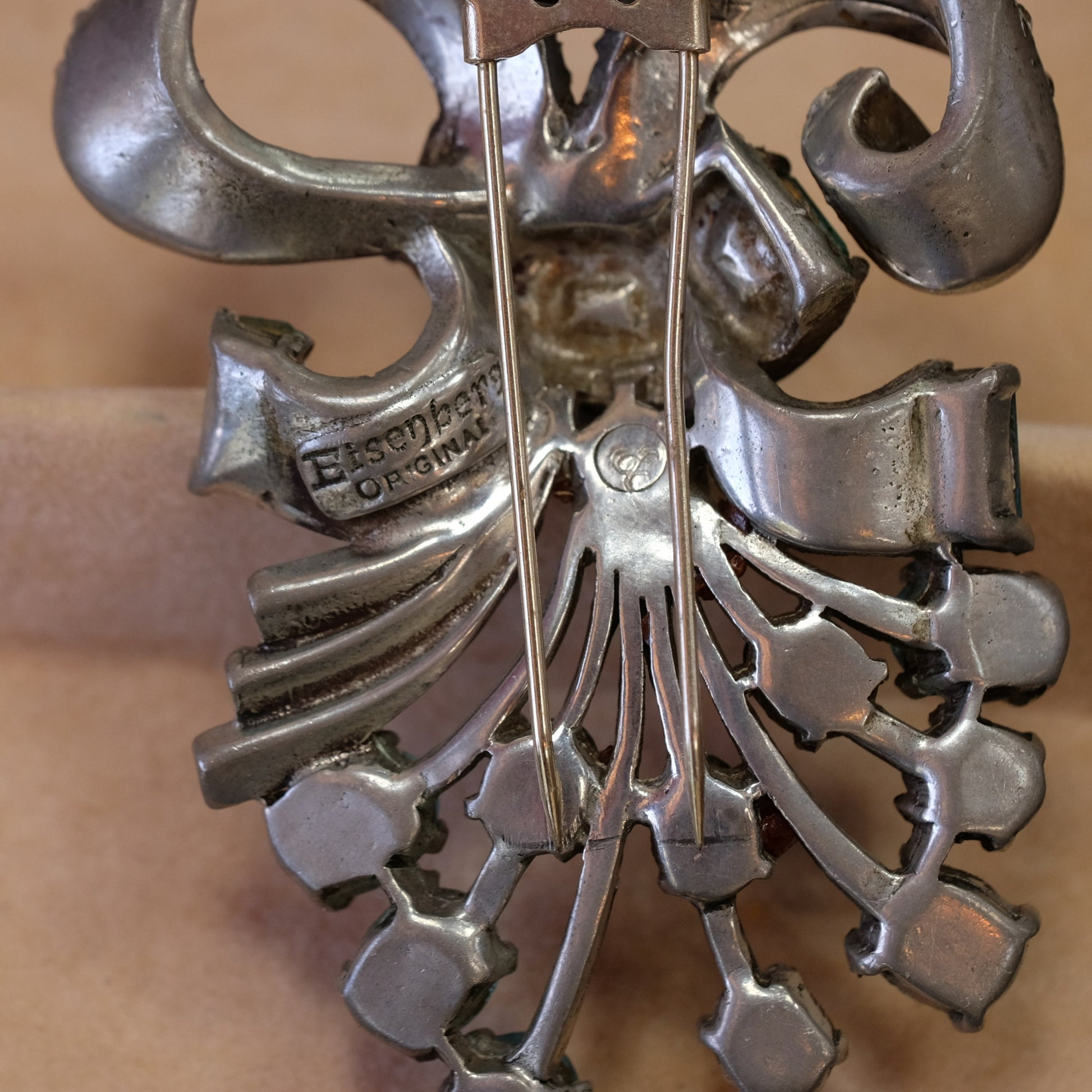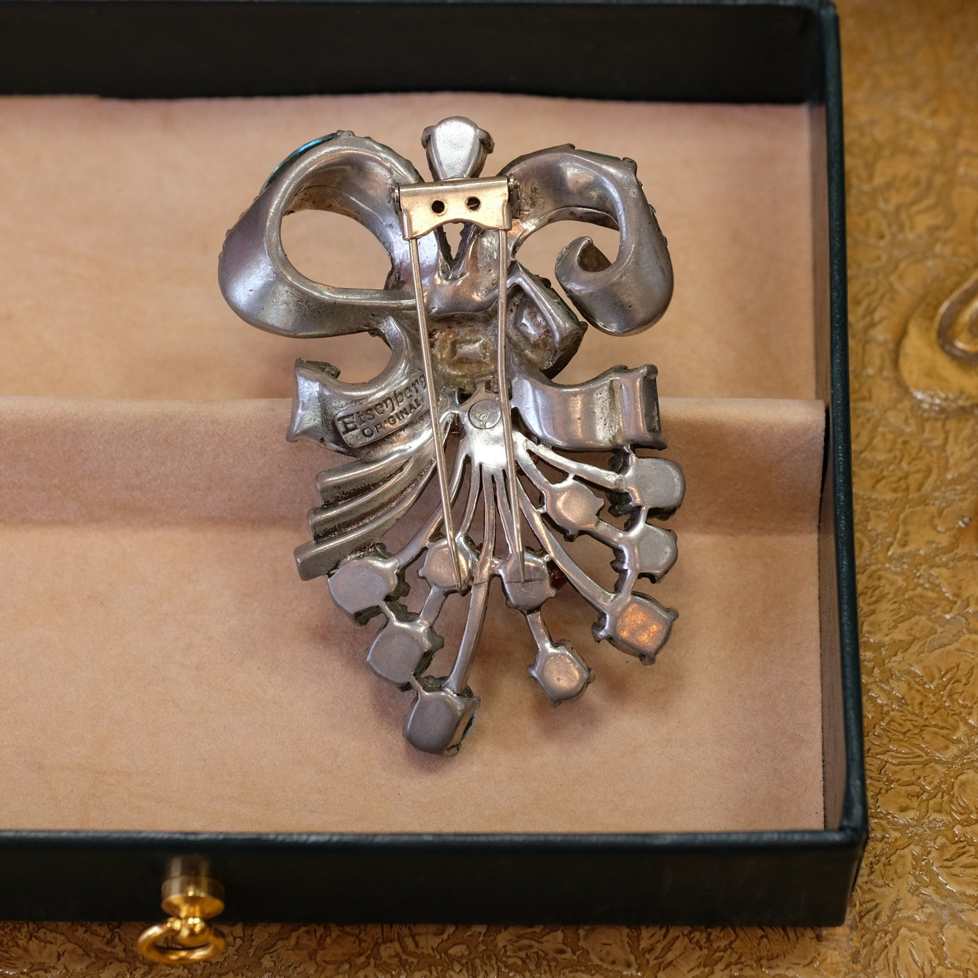 An exquisite Eisenberg Originals fur clip from the 1940s, featuring brilliant blue rhinestones set in lustrous metal. This vintage accessory showcases the exceptional craftsmanship Eisenberg was renowned for during the golden age of costume jewelry. Measuring 3.25" x 2.25", this piece is perfectly sized to add glamorous sparkle to fur stoles, collars, or shawls. The vibrant blue stones catch light beautifully, making it an ideal statement piece for vintage jewelry collectors or anyone seeking authentic mid-century elegance. A timeless treasure from a celebrated era of American jewelry design.