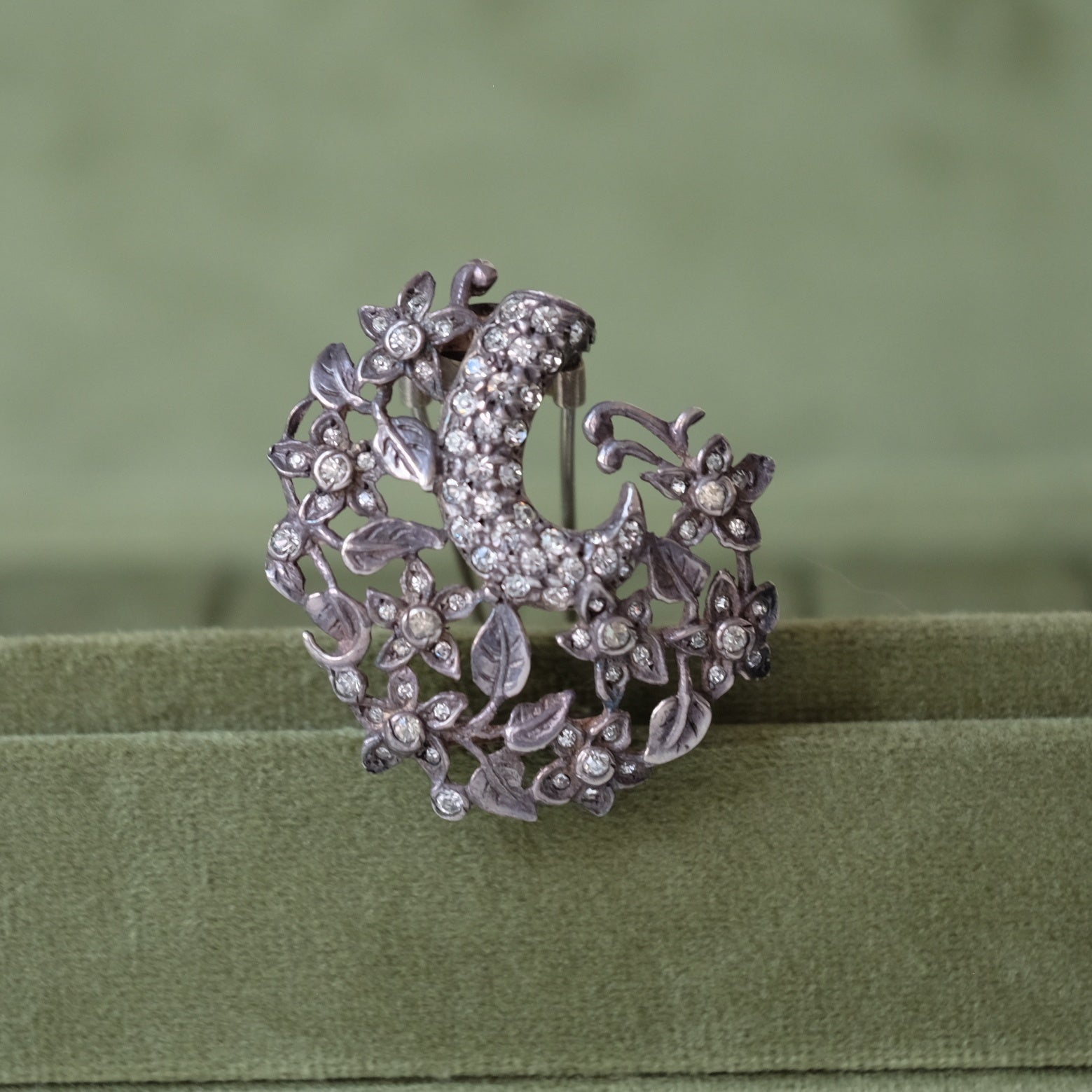This Eisenberg Original Sterling Dress Clip from the 1940s features elegant flower motifs crafted in sterling silver. A timeless accessory, it adds a touch of vintage charm to any outfit, perfect for collectors or those who appreciate classic jewelry design.