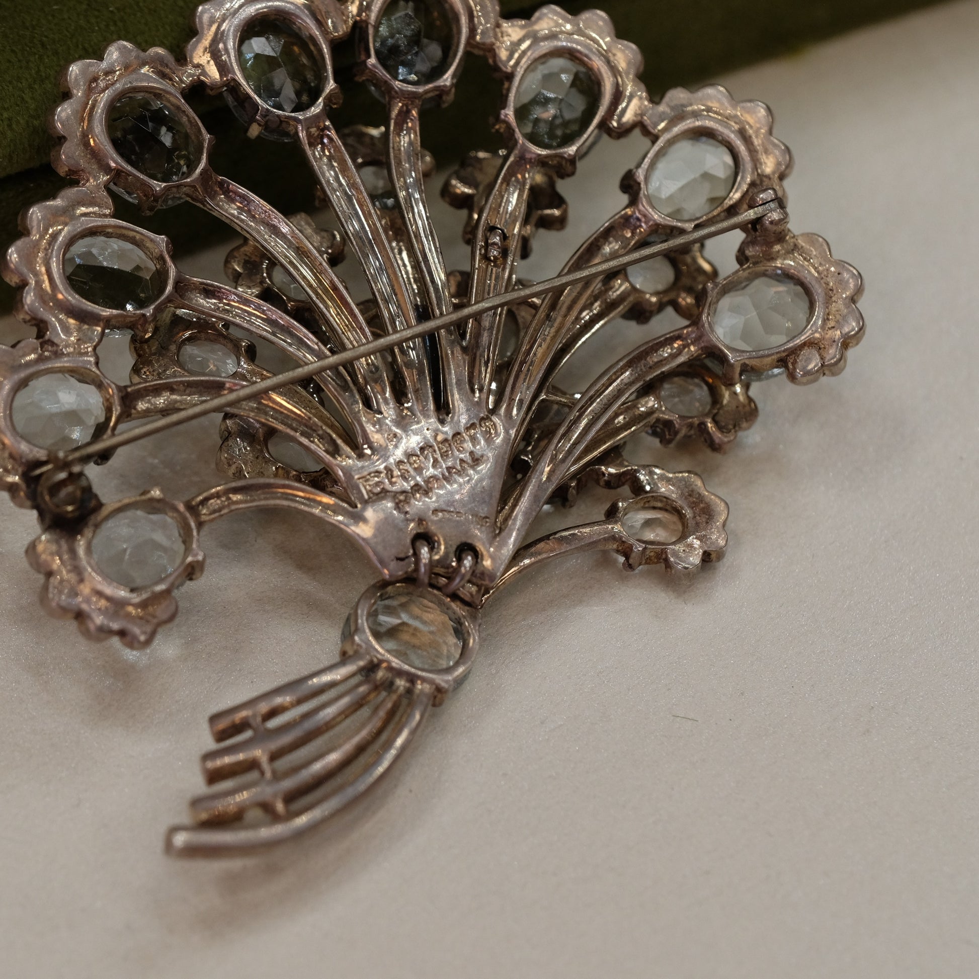 This striking 1940s Eisenberg brooch showcases the iconic fan design characteristic of the era's jewelry craftsmanship. Crafted in sterling silver, this "book piece" brooch features the detailed metalwork and elegant proportions that made Eisenberg a sought-after name in vintage costume jewelry. The fan motif captures the Art Deco sensibility popular during the 1940s, with refined lines and dimensional construction. Perfect for collectors of authentic vintage brooches or anyone seeking a timeless accessory with genuine historical appeal and quality craftsmanship.