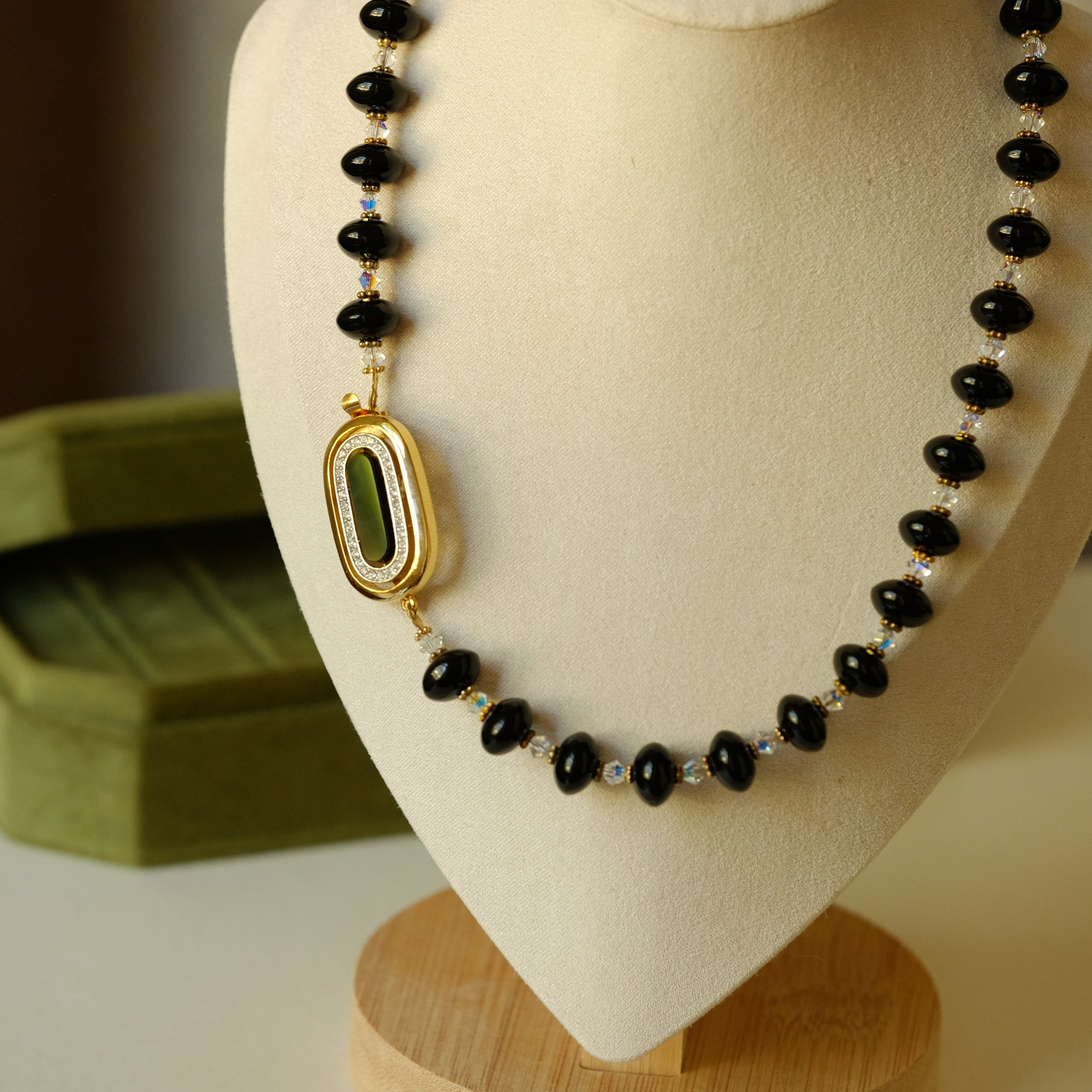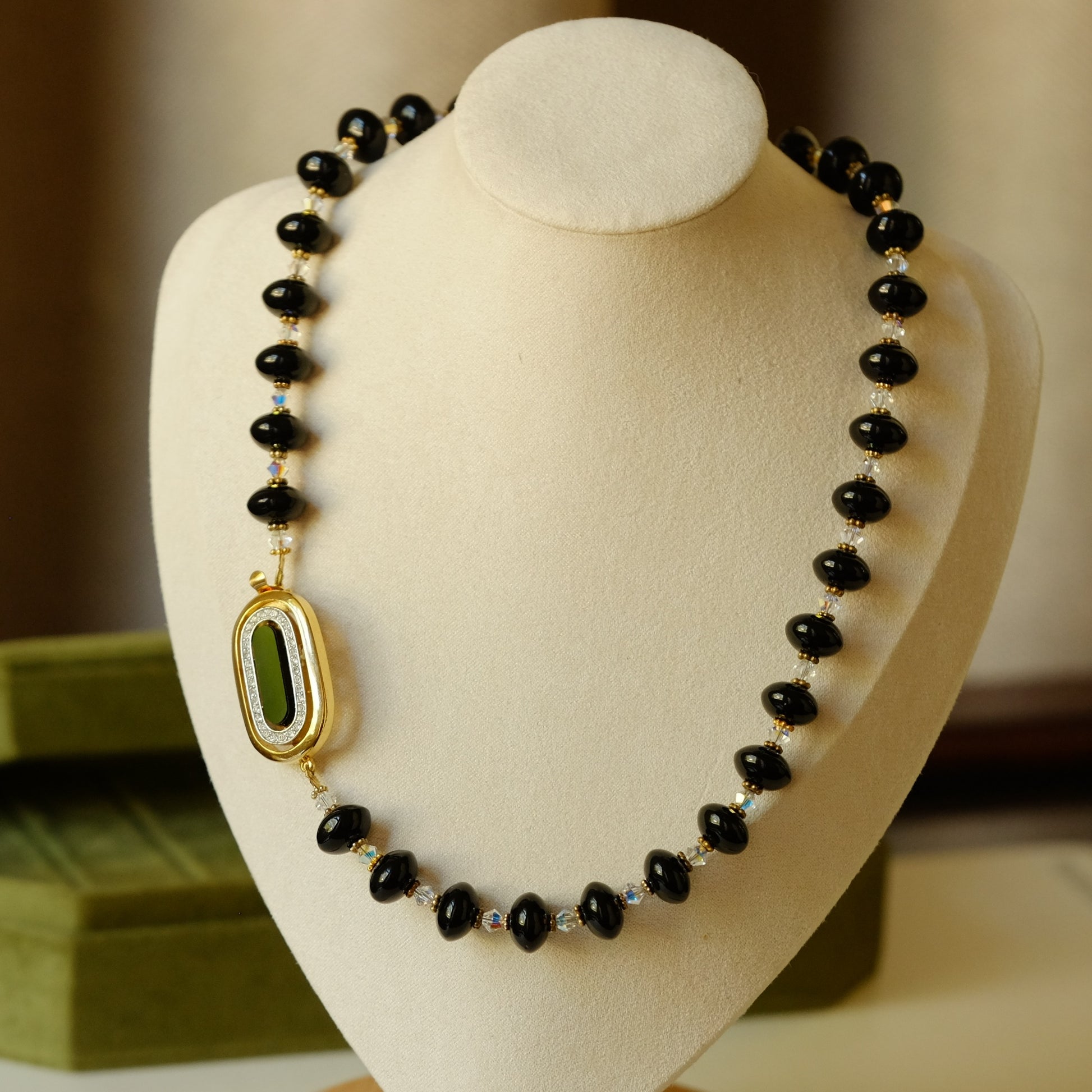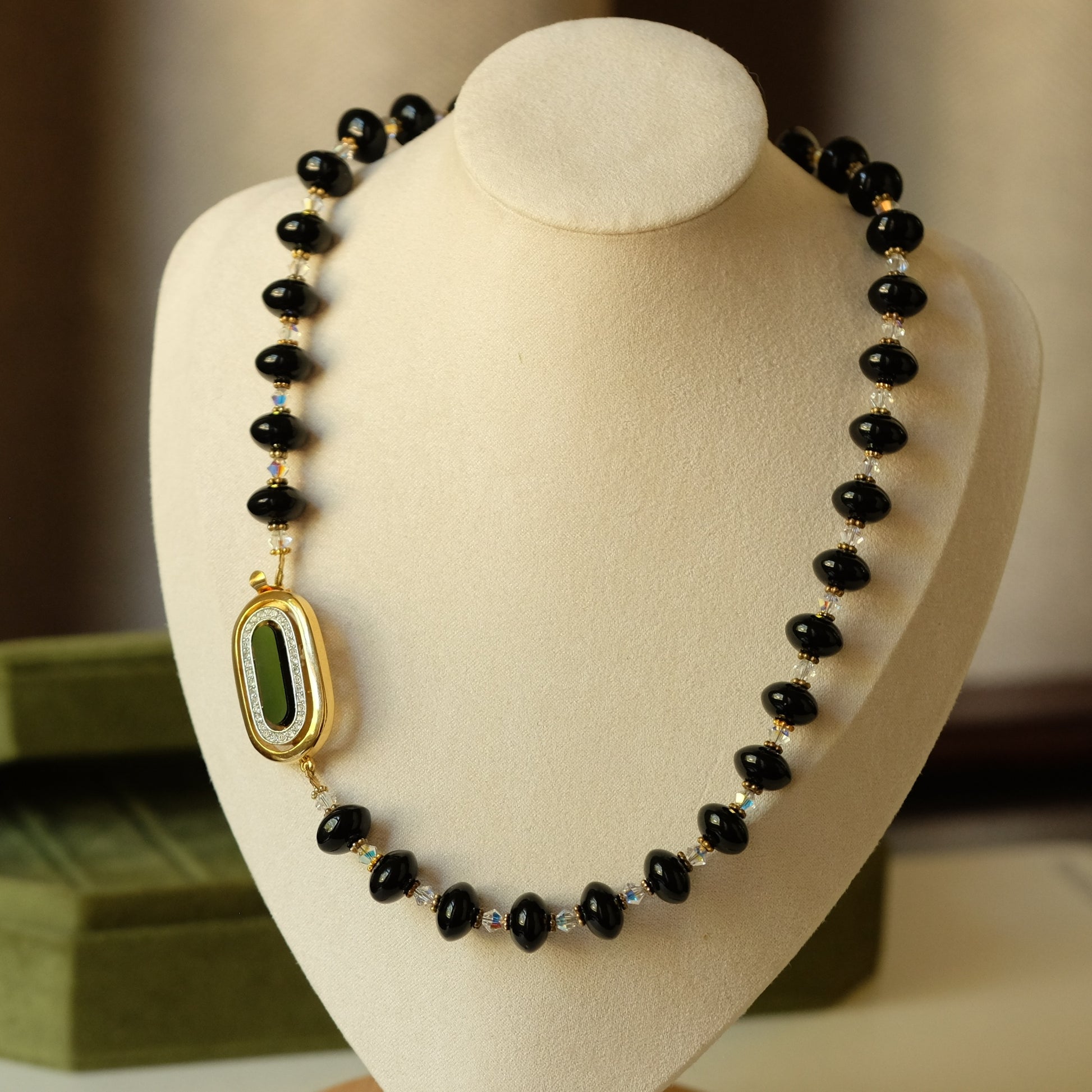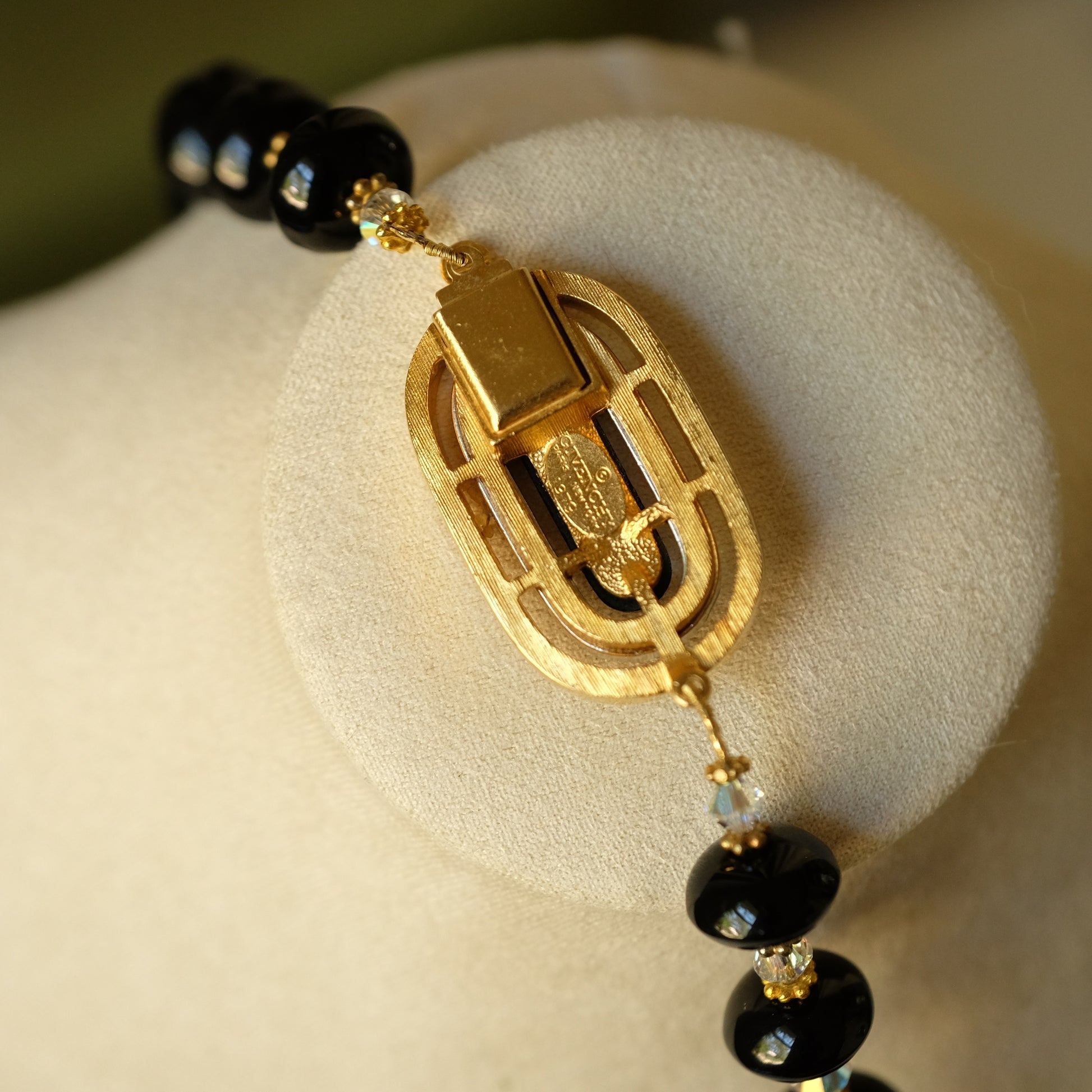 This vintage Givenchy necklace from the 1970s features striking black glass elements that embody timeless elegance. Its bold design makes it a versatile accessory that complements both casual and formal outfits, adding a touch of sophistication to your look. Perfect for collectors or lovers of classic jewelry, this piece showcases the craftsmanship and style that defined the era.