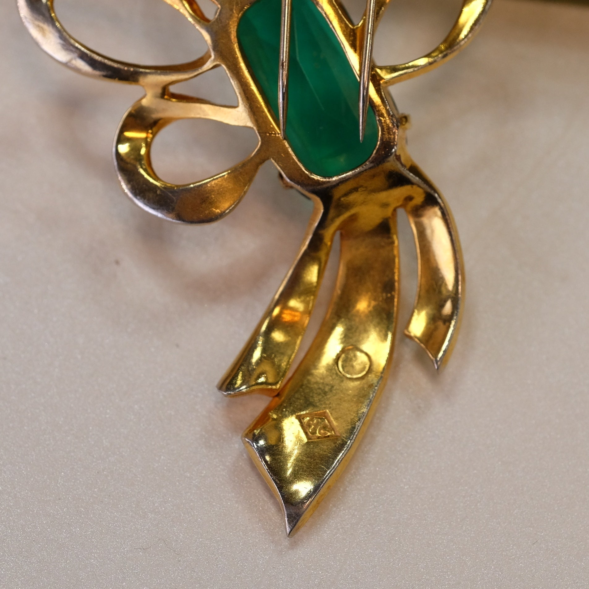 This elegant 1940s dress clip by Hattie Carnegie features lustrous green glass set in a vintage metal mounting. A quintessential accessory from the golden age of costume jewelry, this piece exemplifies the designer's signature craftsmanship and attention to detail. The rich green hue and substantial weight make it a striking addition to any vintage collection. Perfect for styling period garments or as a standalone collectible, this dress clip captures the glamour and sophistication of mid-century fashion. A timeless treasure for vintage enthusiasts and jewelry collectors alike.