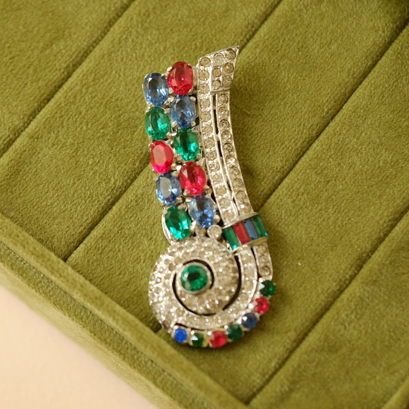This exquisite jewel tone dress clip from the 1930s, crafted by Marcel Boucher, showcases vintage elegance and timeless design. Its vibrant colors and intricate detailing make it a perfect accessory to enhance any outfit, adding a touch of classic sophistication. Ideal for collectors or those who appreciate fine antique jewelry.