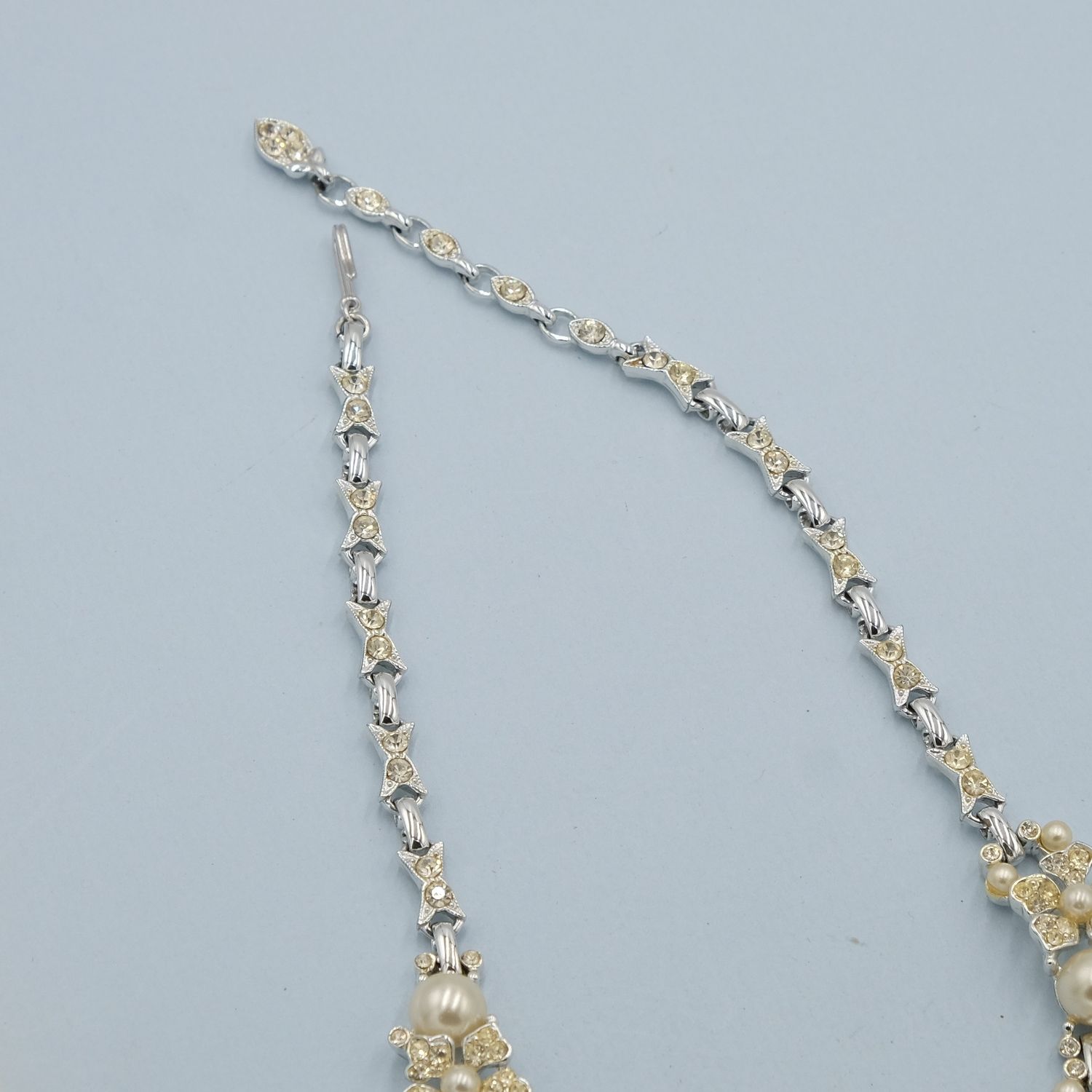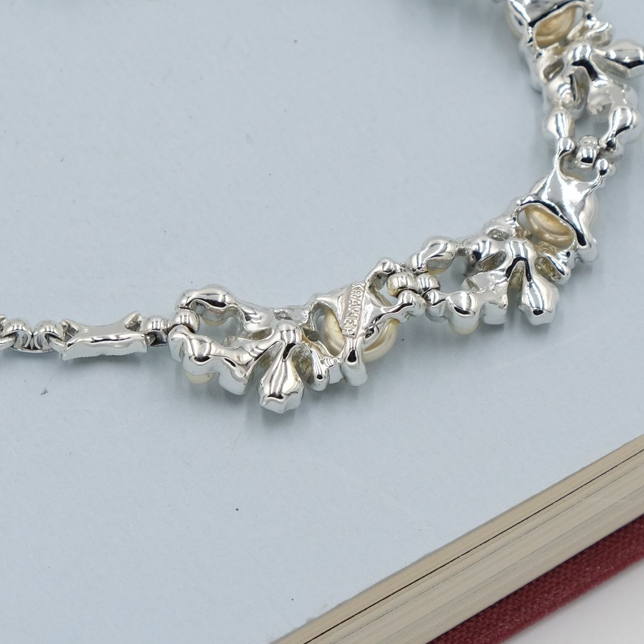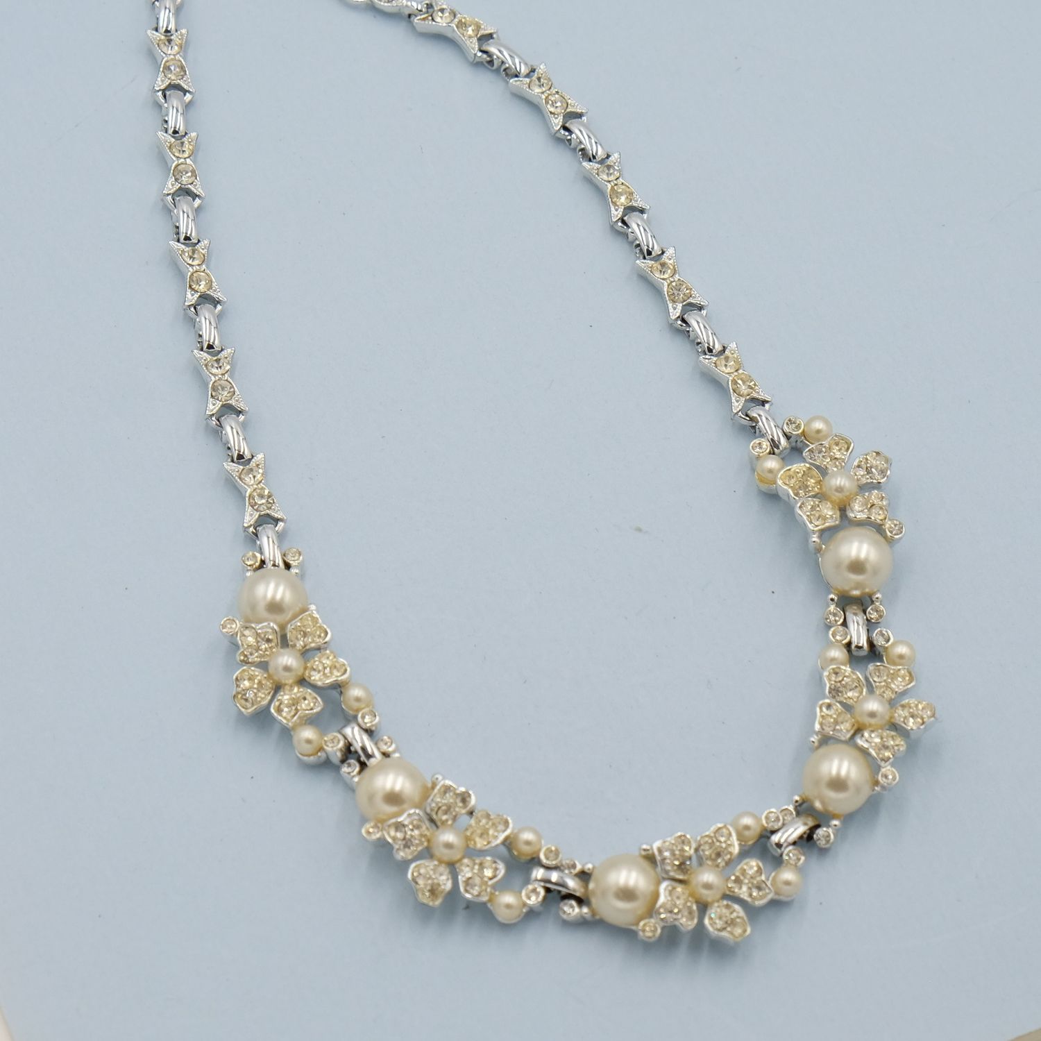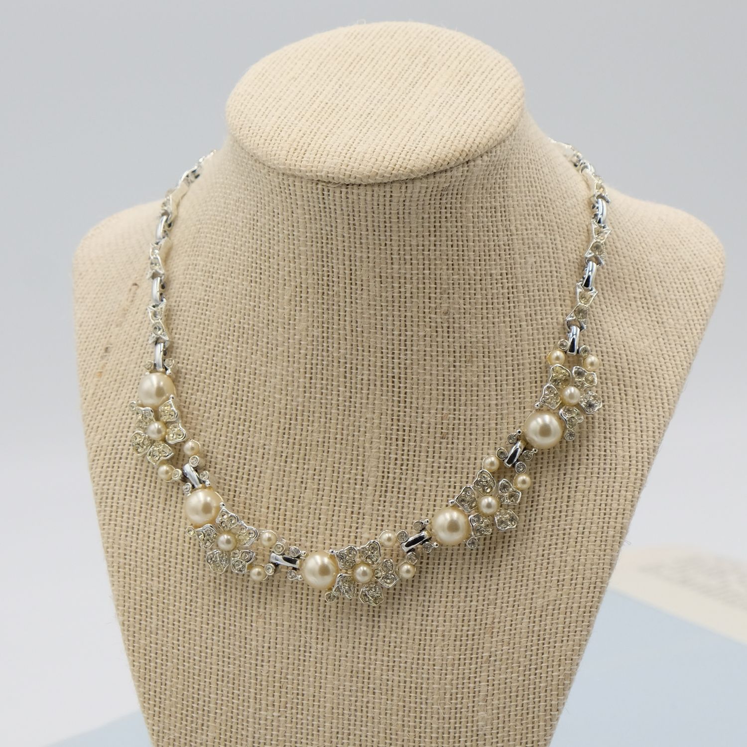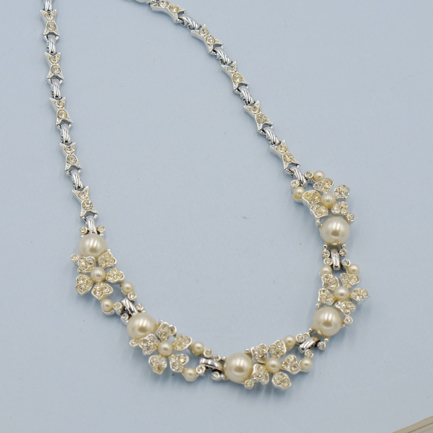 This Kramer necklace from the 1950s features delicate floral designs paired with lustrous faux pearls, embodying vintage elegance. Its timeless style makes it a versatile accessory to enhance both casual and formal outfits with a touch of classic charm.