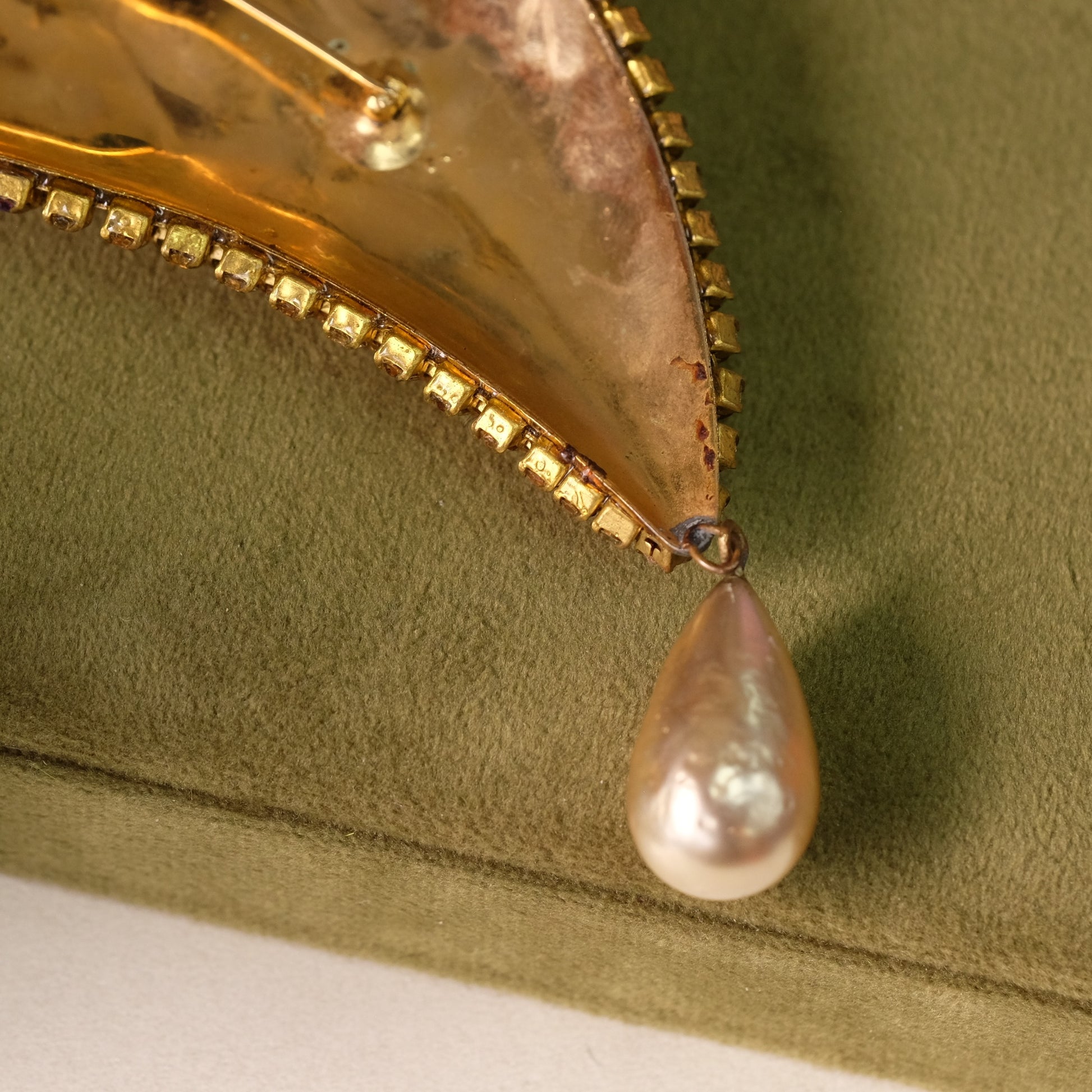 This striking 1950s European brooch features a substantial drop design that makes a bold statement. Crafted with the quality and artistry characteristic of mid-century European jewelry, the piece showcases elegant proportions and refined detailing. The generous size and weight give it presence and gravitas, making it an ideal focal point for vintage jewelry collectors or those seeking a distinctive accessory with authentic period character. A timeless addition to any collection of classic European costume or fine jewelry from this celebrated era.