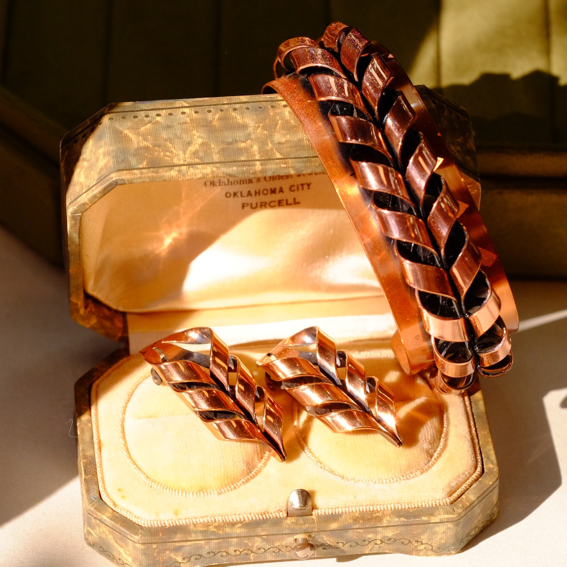 This exquisite 1950s Renoir copper jewelry set showcases the artisanal craftsmanship that defined mid-century metalwork. The coordinated bracelet and earring pieces feature the warm, lustrous patina characteristic of vintage copper, with refined detailing that reflects the era's design sensibilities. Renoir jewelry is highly sought by collectors for its quality construction and timeless aesthetic. Perfect for adding vintage elegance to any collection or wardrobe.