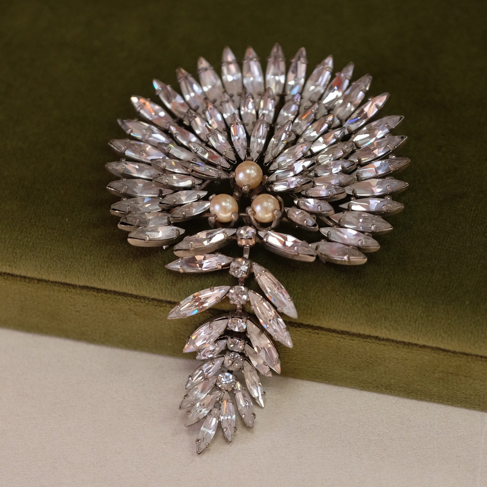 This exquisite cascade brooch by Roger Jean Pierre exemplifies the elegance of 1950s jewelry design. Featuring a graceful waterfall composition of linked elements, the piece showcases the meticulous craftsmanship characteristic of mid-century French artisans. The brooch's dynamic vertical arrangement creates movement and sophistication, making it an ideal statement accessory for vintage enthusiasts and collectors. Perfect for elevating classic attire or adding timeless charm to contemporary styling, this authentic piece carries the prestige of its esteemed maker.