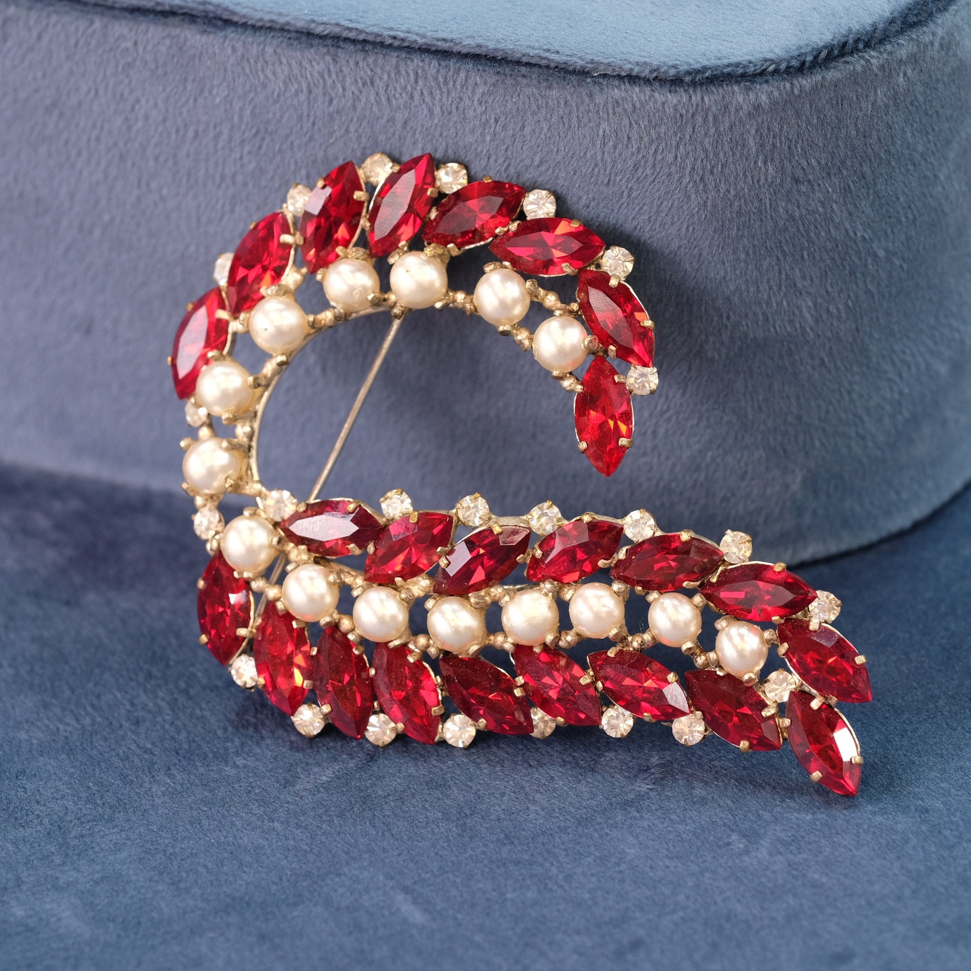 A striking vintage brooch by renowned French designer Roger Scemama, featuring a bold combination of clear and vibrant red elements characteristic of 1950s modernist jewelry design. This substantial piece showcases Scemama's signature geometric aesthetic and masterful use of color, making it an exceptional statement accessory for collectors of mid-century costume jewelry. The generous scale and dynamic contrast between the clear and red components create visual impact whether worn or displayed. A timeless example of post-war French design craftsmanship.