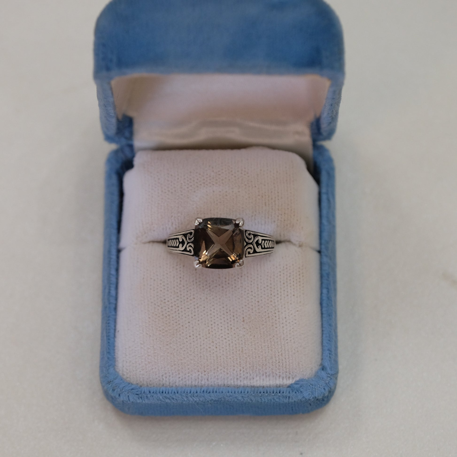 This elegant silver ring features a striking smokey quartz stone, prized for its warm, translucent beauty and grounding energy. The band showcases delicate etching details that add vintage charm and sophistication. Sized at 9, this piece combines timeless design with natural gemstone appeal, making it perfect for everyday wear or special occasions. A versatile addition to any jewelry collection.