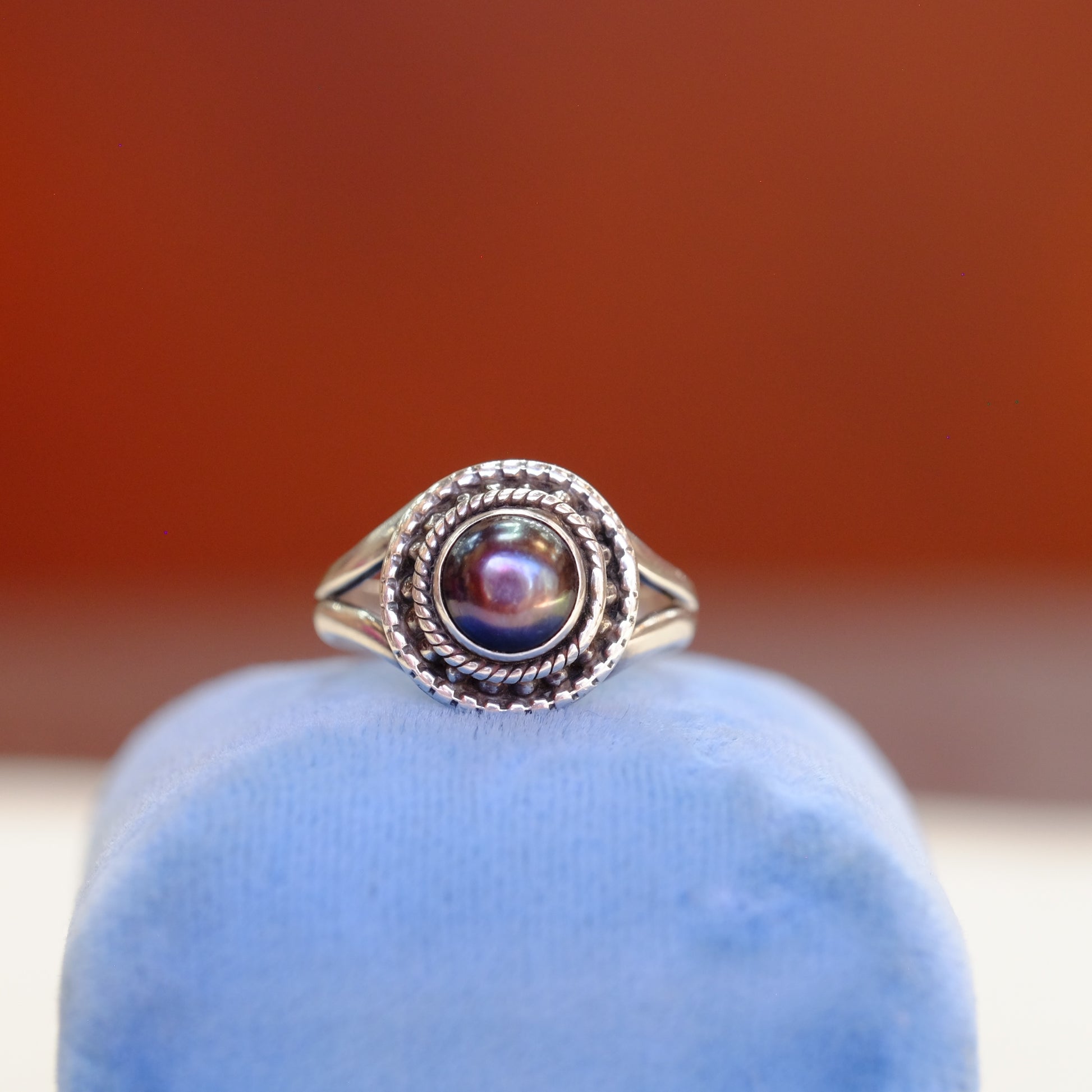 This elegant silver bezel setting showcases a lustrous black pearl, creating a timeless piece with sophisticated appeal. The silver frame complements the pearl's deep luster, making this ring suitable for both everyday wear and special occasions. Size 7. A classic addition to any jewelry collection that pairs effortlessly with various styles.