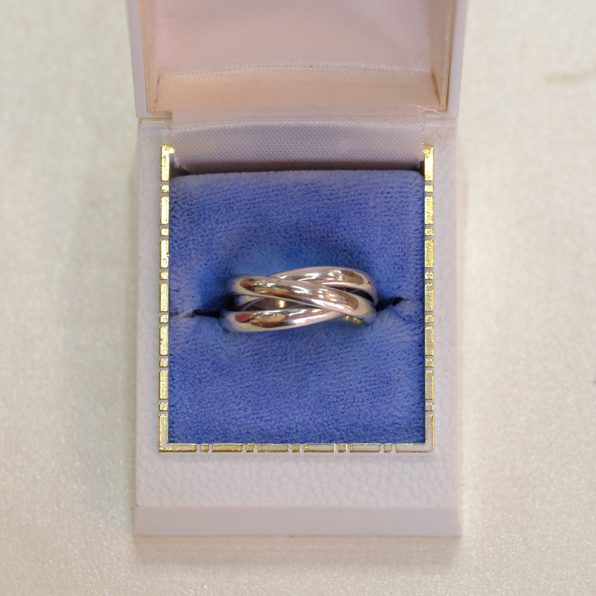 This elegant silver trinity ring features three interlocking bands symbolizing friendship, love, and loyalty. Crafted in lustrous silver, the design offers timeless sophistication perfect for meaningful gift-giving or personal wear. The ring arrives in size 5.75 and can be personalized with custom friendship engraving to commemorate a special bond. An ideal keepsake that celebrates the connections that matter most.