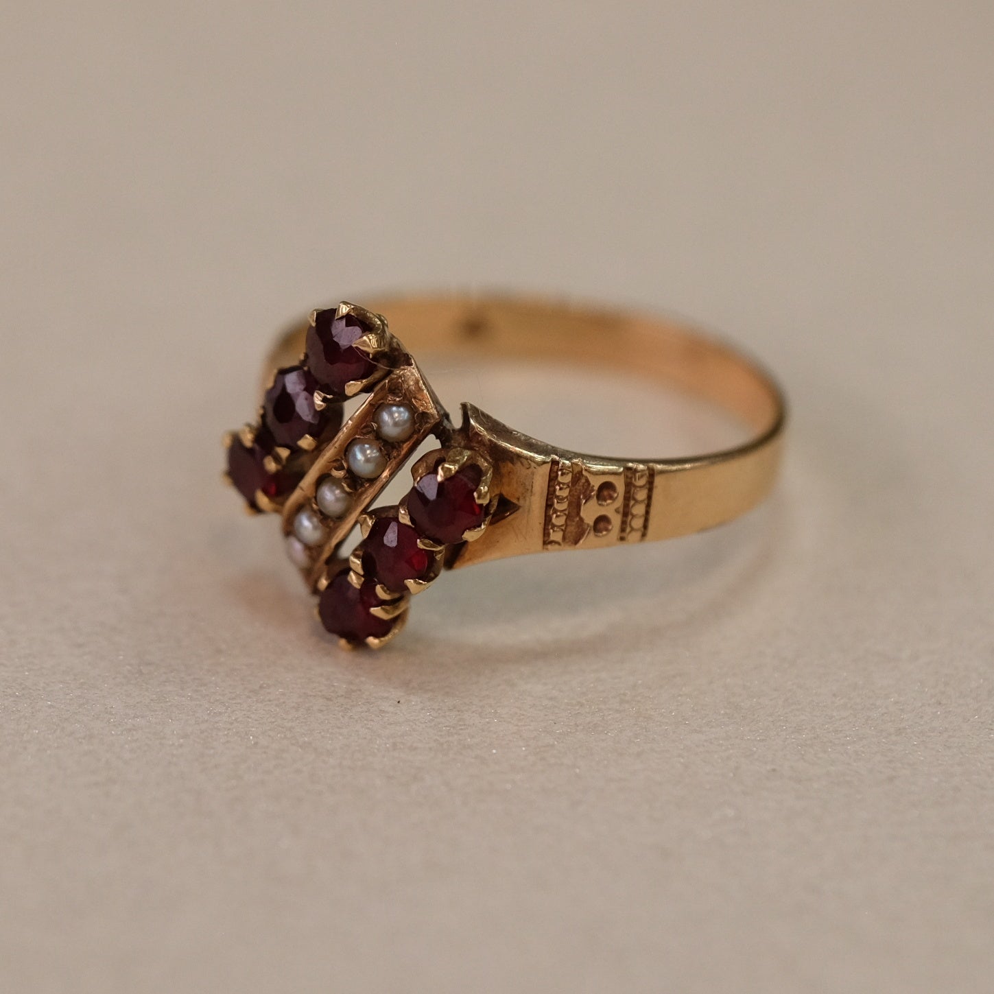 This exquisite Victorian-era ring showcases a deep crimson garnet centerpiece accented with delicate seed pearls, crafted in 10K gold. The intricate design reflects the romantic sensibilities of the Victorian period, featuring ornate detailing that frames the rich gemstone. Perfect for collectors of antique jewelry or those seeking a distinctive vintage piece with timeless elegance and historical charm.