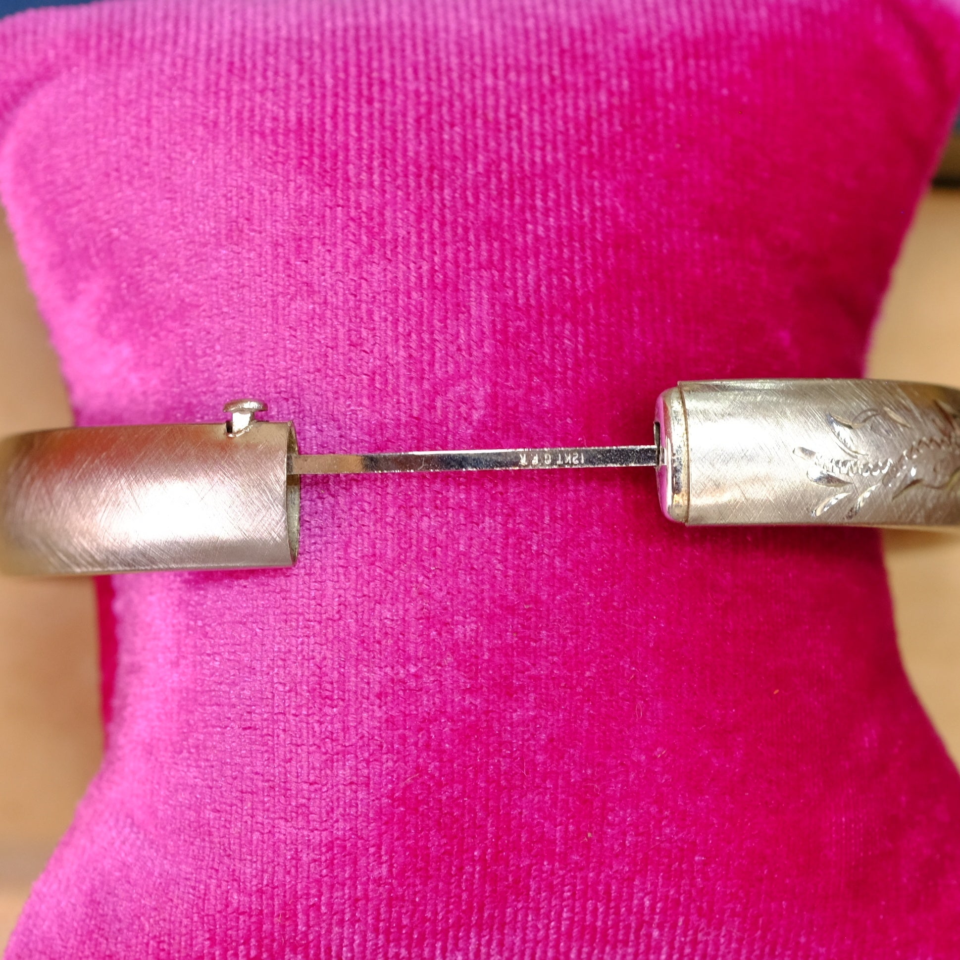This exquisite Victorian-era bangle combines timeless elegance with refined craftsmanship. Crafted from gold-filled metal with rhodium plating, it features a lustrous finish that resists tarnishing while maintaining its brilliant shine. The bangle showcases intricate engraving details characteristic of the Victorian period, adding depth and sophistication to its design. Perfect for collectors of vintage jewelry or anyone seeking a statement piece with historical charm, this bangle works beautifully as an everyday accessory or special occasion treasure. A stunning addition to any jewelry collection.