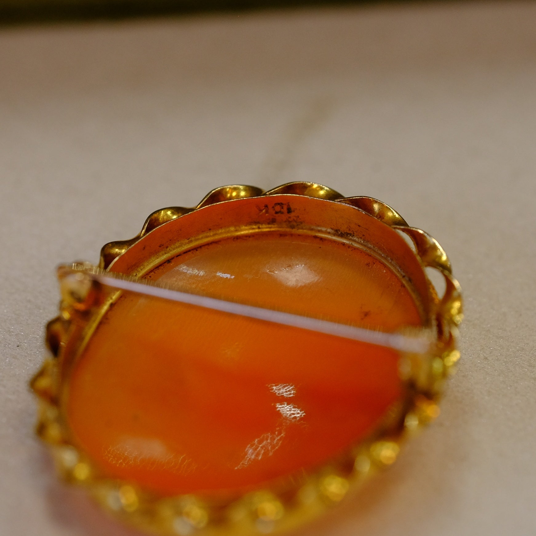 This exquisite vintage cameo brooch showcases a delicately carved profile set in lustrous 10k yellow gold. The timeless design captures the elegance of classic jewelry craftsmanship, featuring fine detailing that reflects the artistry of its era. Perfect for adding a touch of refined sophistication to any ensemble, this piece serves as both a wearable treasure and a conversation starter. An ideal addition to vintage jewelry collections or a meaningful gift for those who appreciate enduring style and quality craftsmanship.