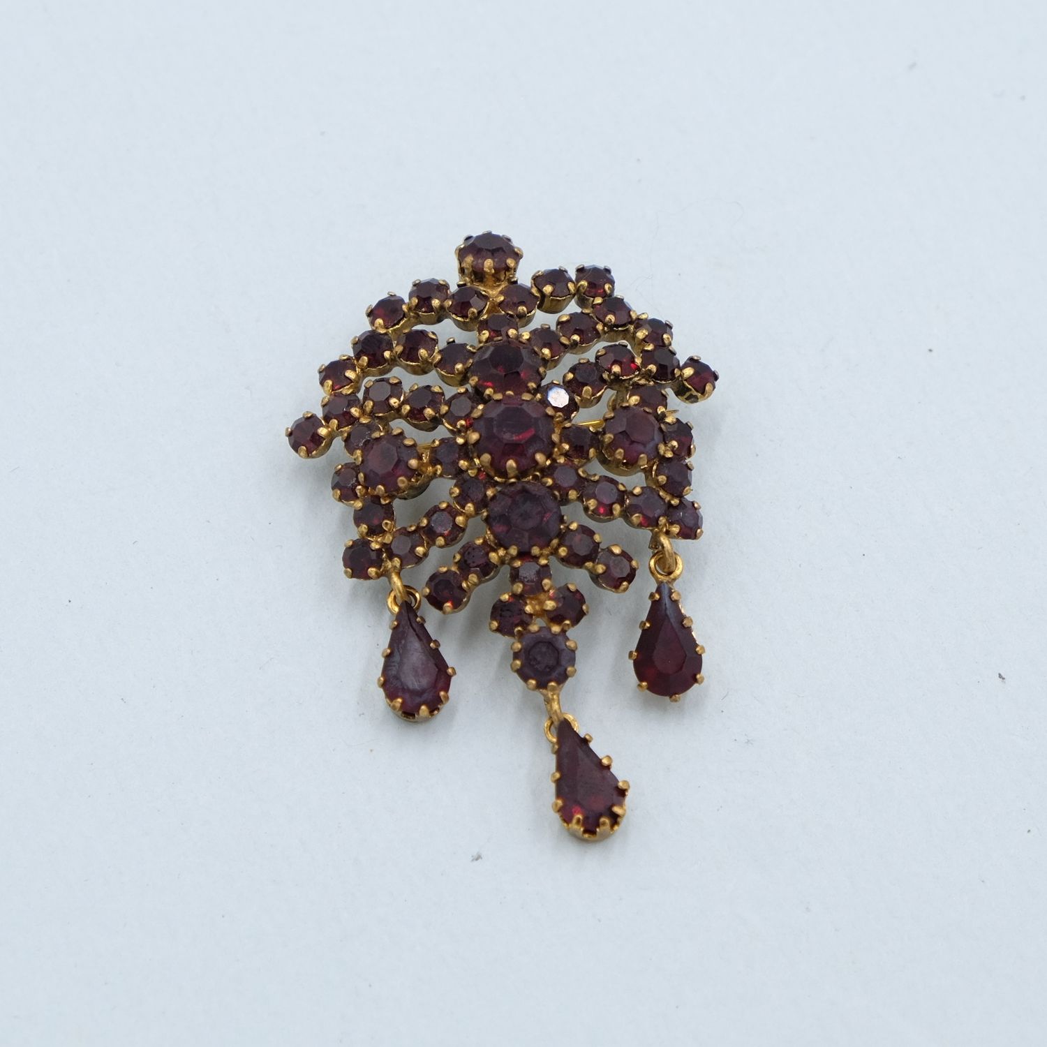 This signed Vintage Austria brooch from the 1960s features faux garnet stones and is preserved in excellent condition.