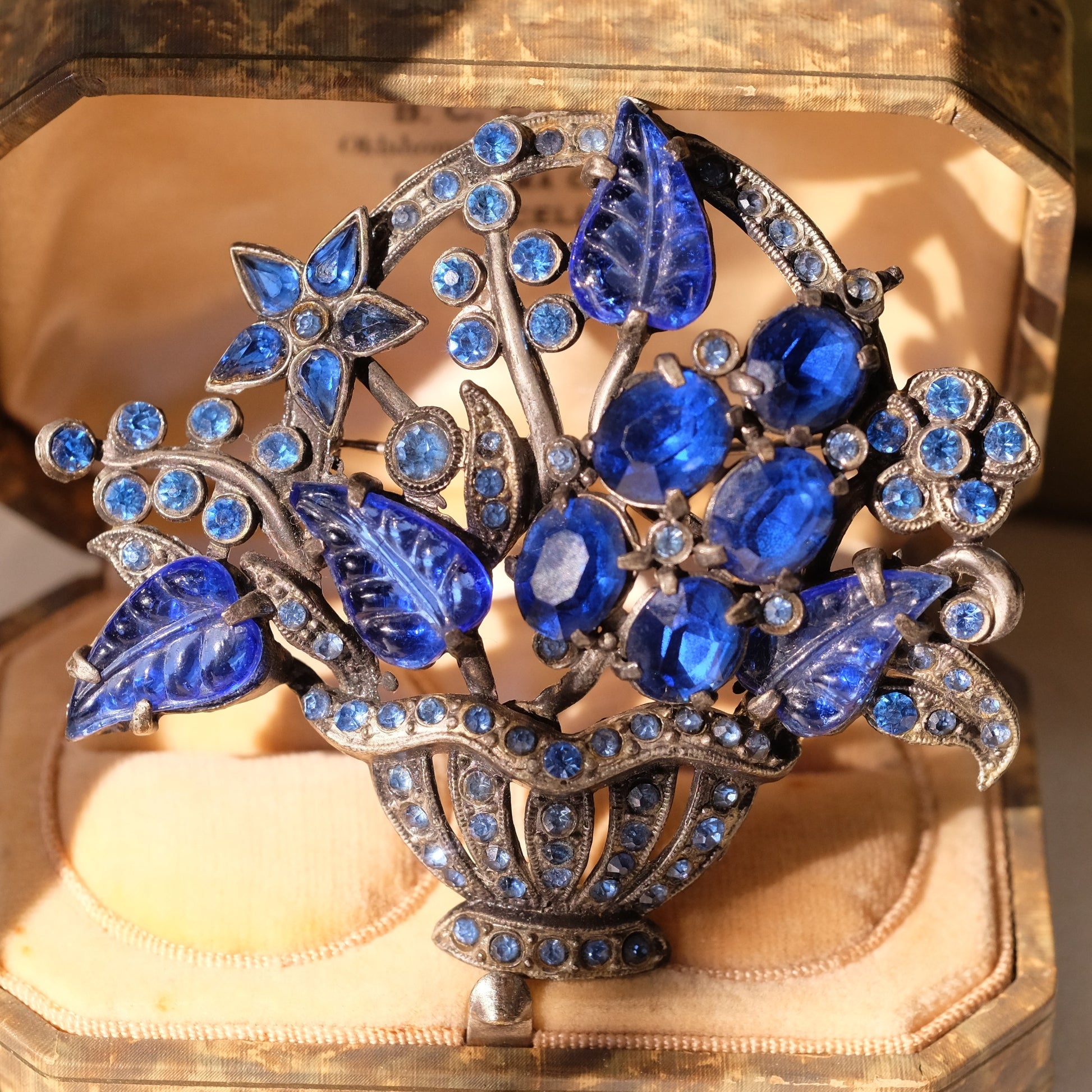 This exquisite 1930s brooch features intricately carved blue glass fashioned into a delicate basket design. A stunning example of Art Deco craftsmanship, the piece showcases the skilled artistry characteristic of the era. The rich blue glass catches light beautifully, making it an eye-catching accessory for vintage jewelry enthusiasts. Perfect for collectors seeking authentic period pieces or anyone looking to add timeless elegance to their wardrobe. A remarkable find from nearly a century ago.