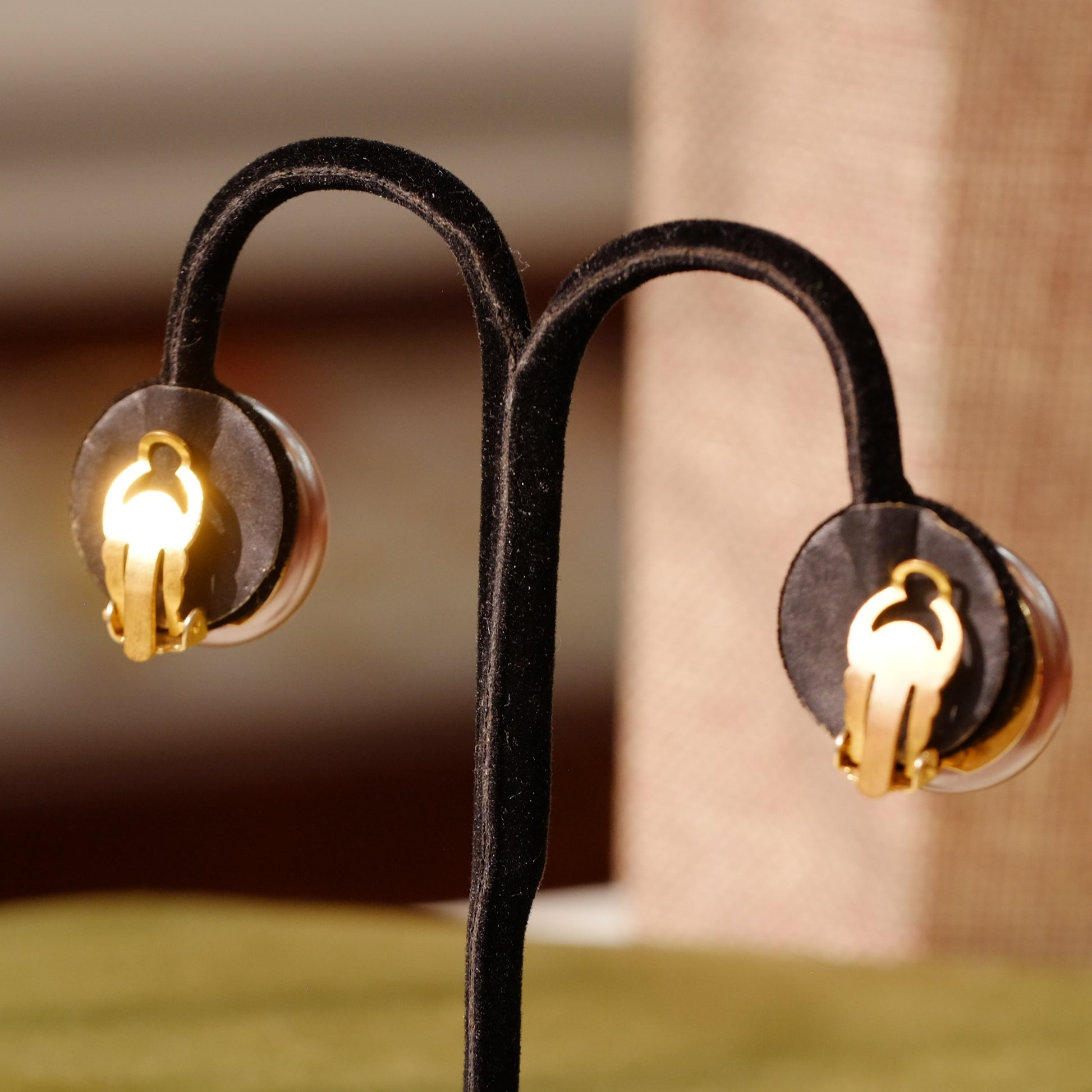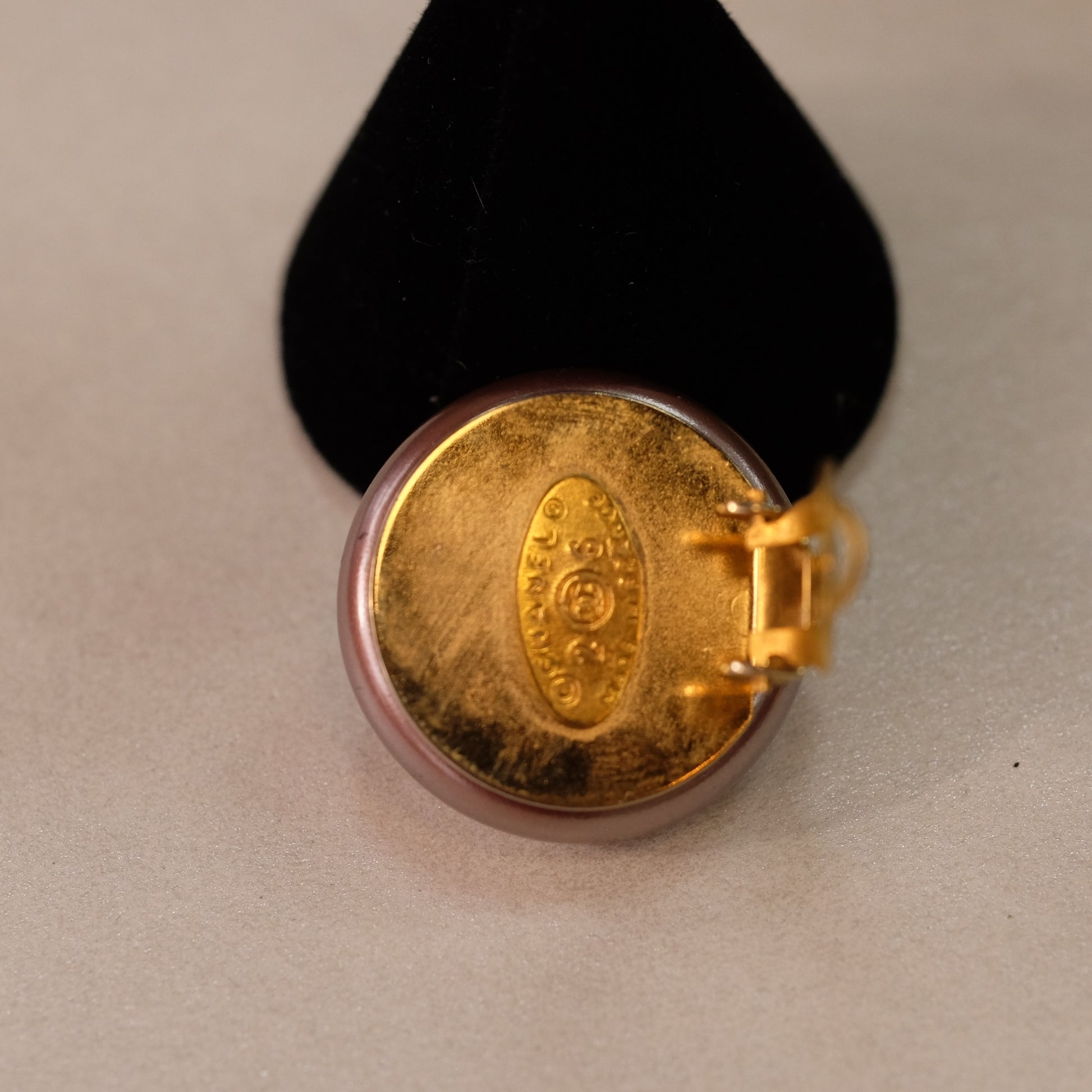 Authentic vintage Chanel clip-on earrings from the 1990s, featuring the iconic interlocking CC logo design. Crafted with grey pearl accents that add subtle elegance to any ensemble. These non-pierced earrings offer comfortable wear throughout the day and pair beautifully with both casual and formal outfits. A timeless piece that captures the luxury and sophistication Chanel is known for. Perfect for collectors or anyone seeking genuine vintage designer jewelry with enduring style.