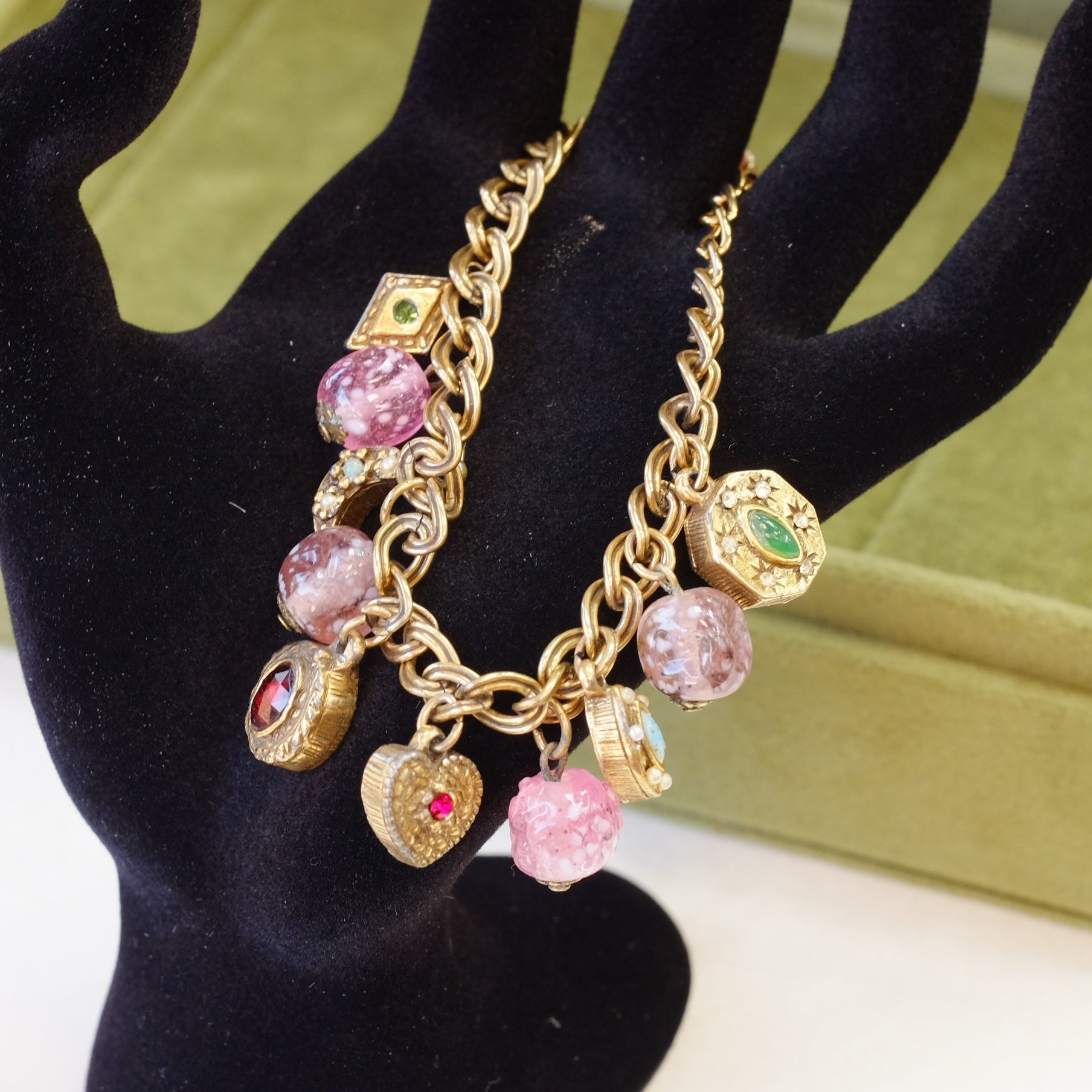 This Vintage Charms Dangle Bracelet from the 1950s features a classic design with multiple delicate charms that move freely, adding timeless elegance to any outfit. Crafted with attention to detail, it captures the nostalgic charm of mid-century style and makes a unique accessory for collectors or vintage enthusiasts. Its versatile look complements both casual and formal wear.
