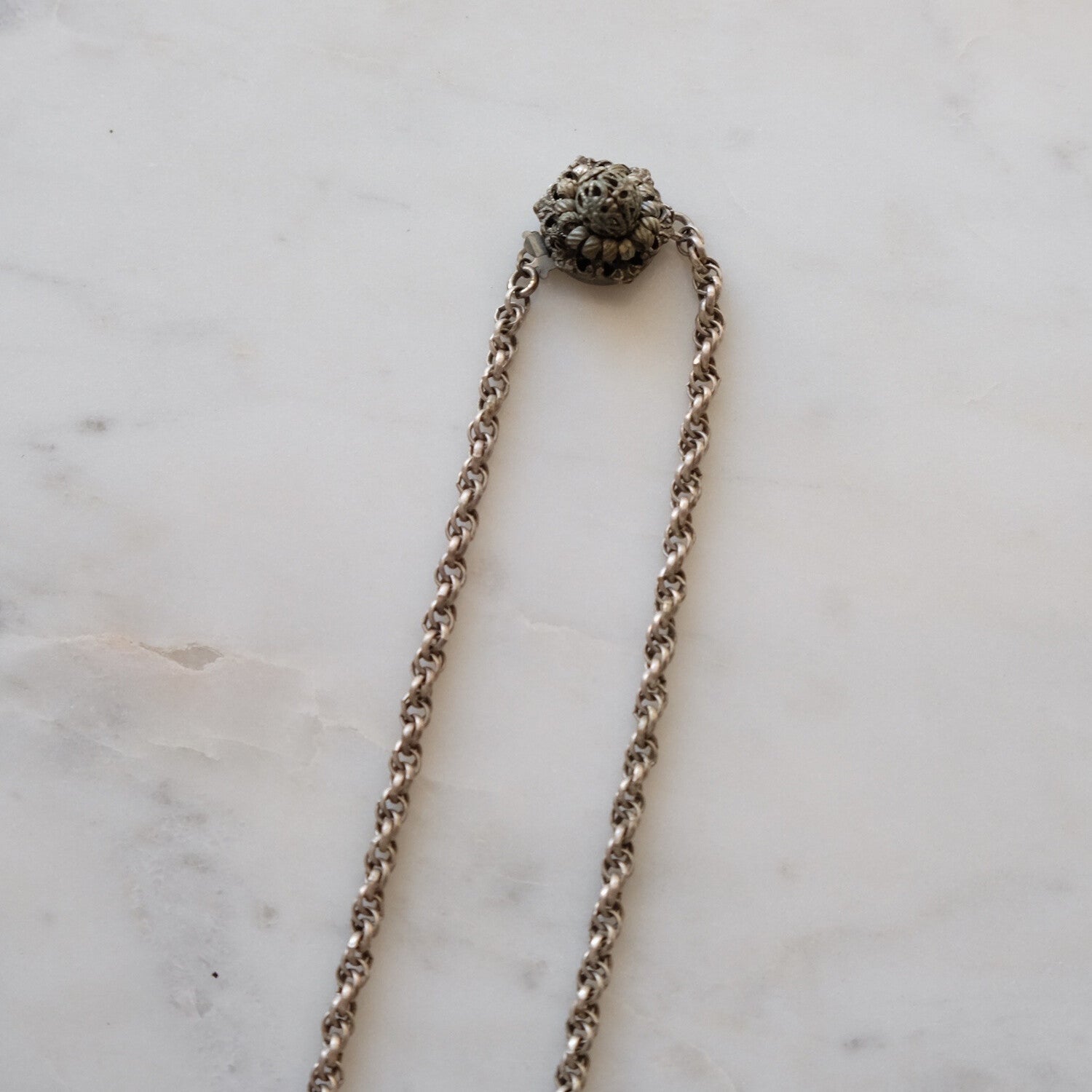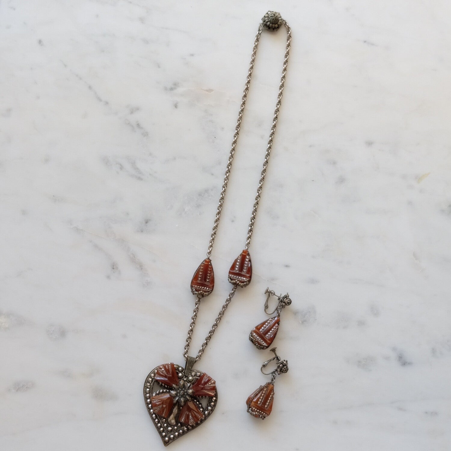 This vintage Miriam Haskell set from the 1950s is a prized collectible in excellent condition. It features a signed necklace measuring 20 inches in length, complemented by a 2.5-inch pendant and matching earrings each 2 inches long.