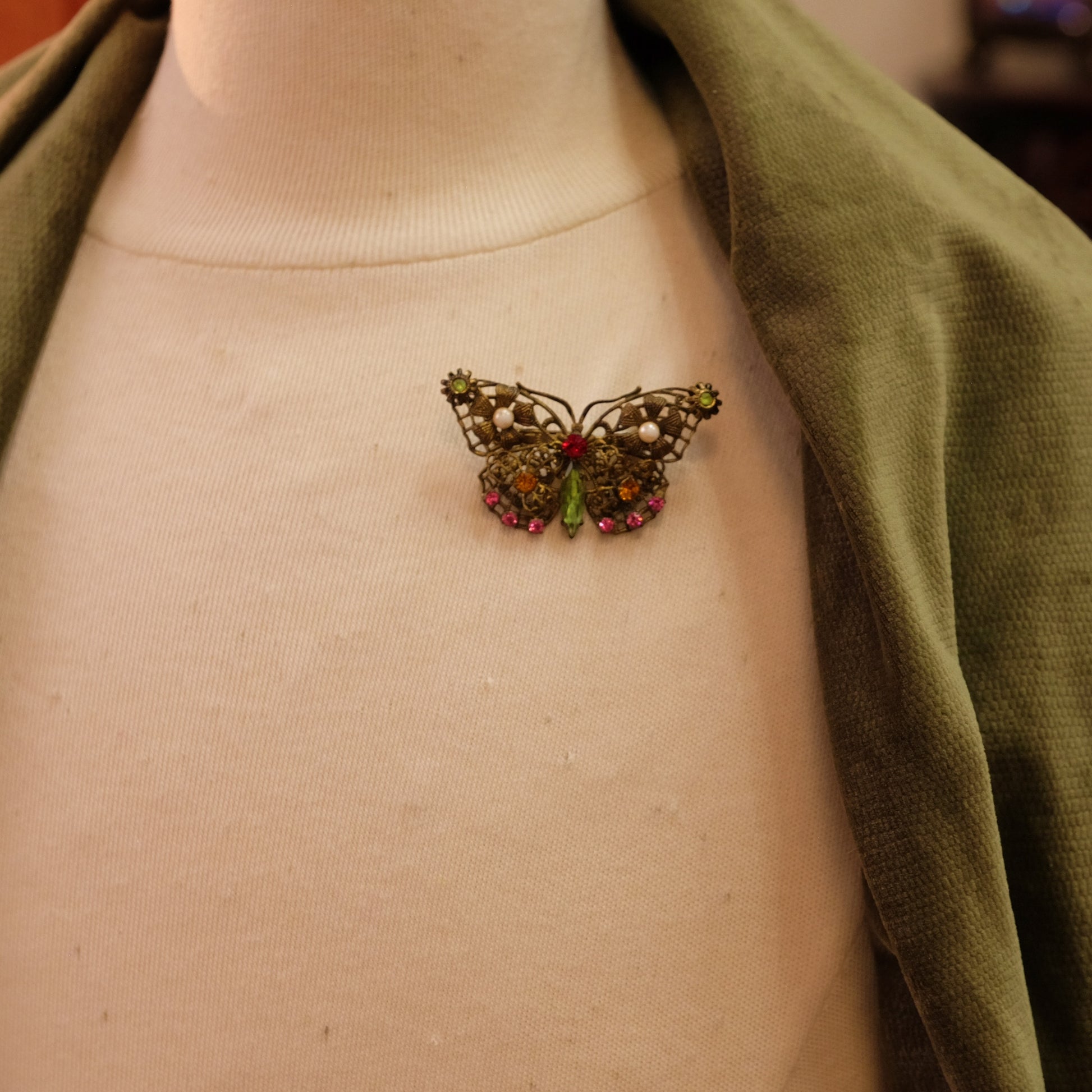 Delicate butterfly pin crafted in Czechoslovakia during the 1930s. This petite brooch features intricate detailing characteristic of Czech artisanal jewelry from the interwar period. The compact design makes it ideal for vintage collectors or those seeking an authentic period accessory. A charming piece of early 20th-century craftsmanship with historical appeal.