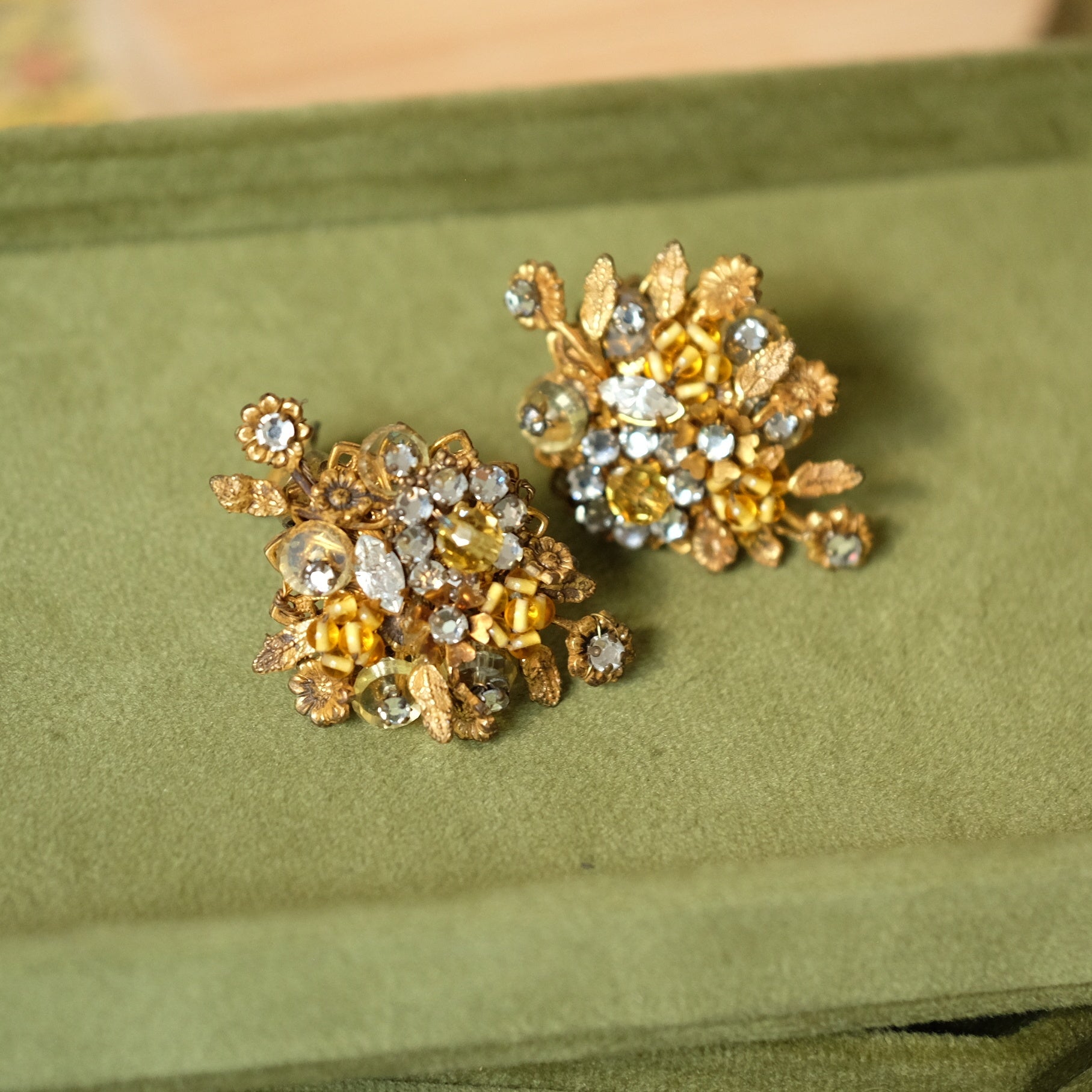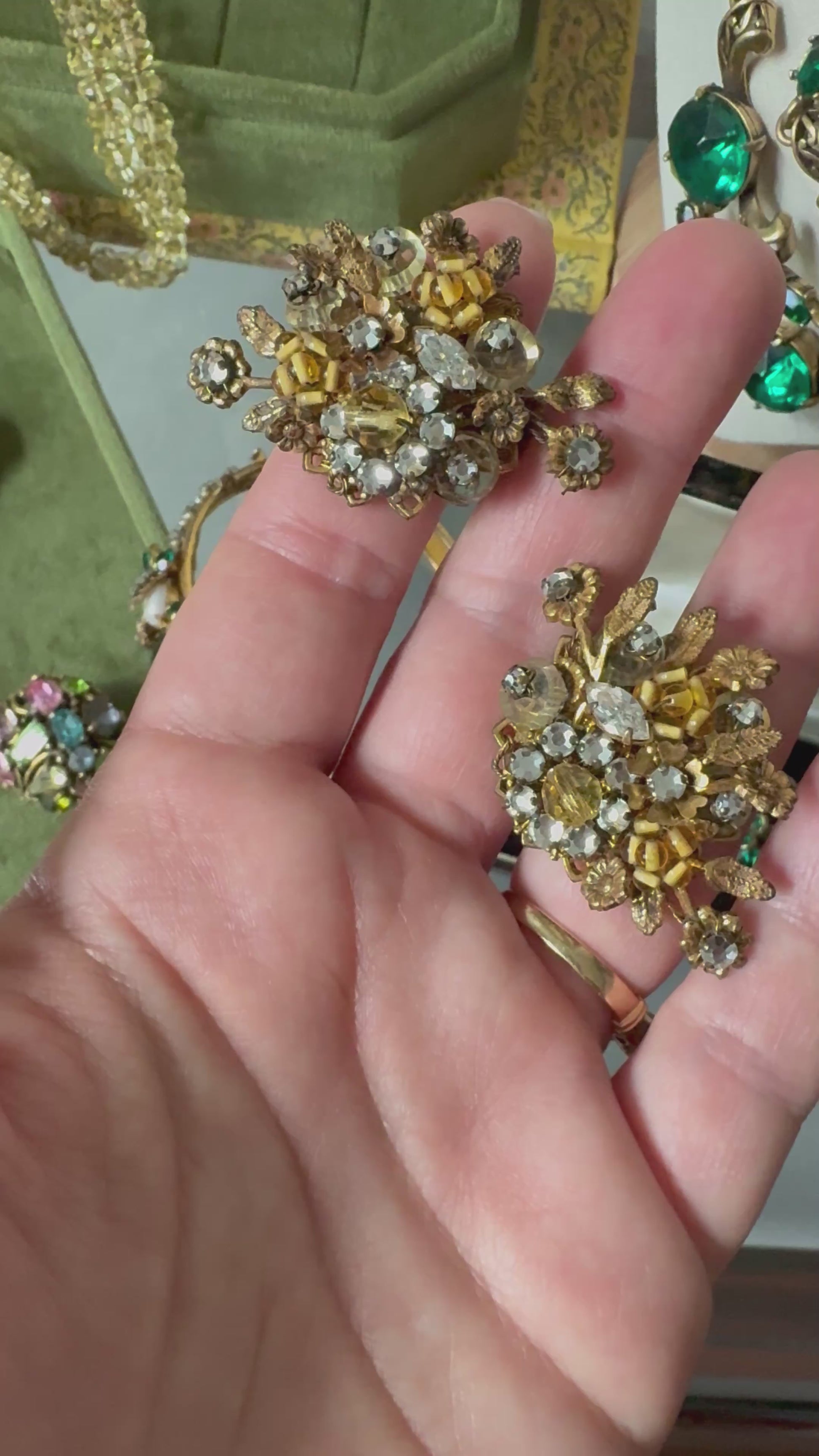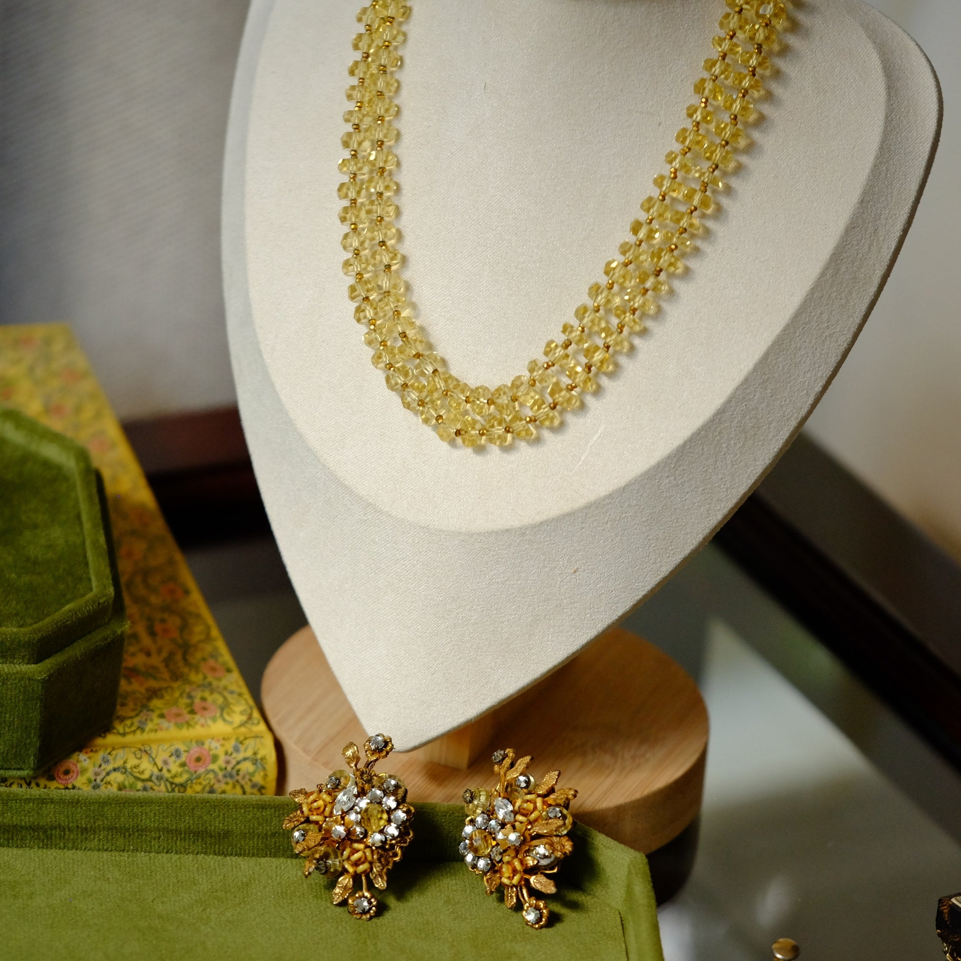 This Vintage DeMario necklace and earrings set from the 1950s features beautifully crafted faux citrine stones. The warm golden hues add a classic touch to any outfit, making it a timeless accessory for vintage jewelry collectors or those seeking elegant retro style.