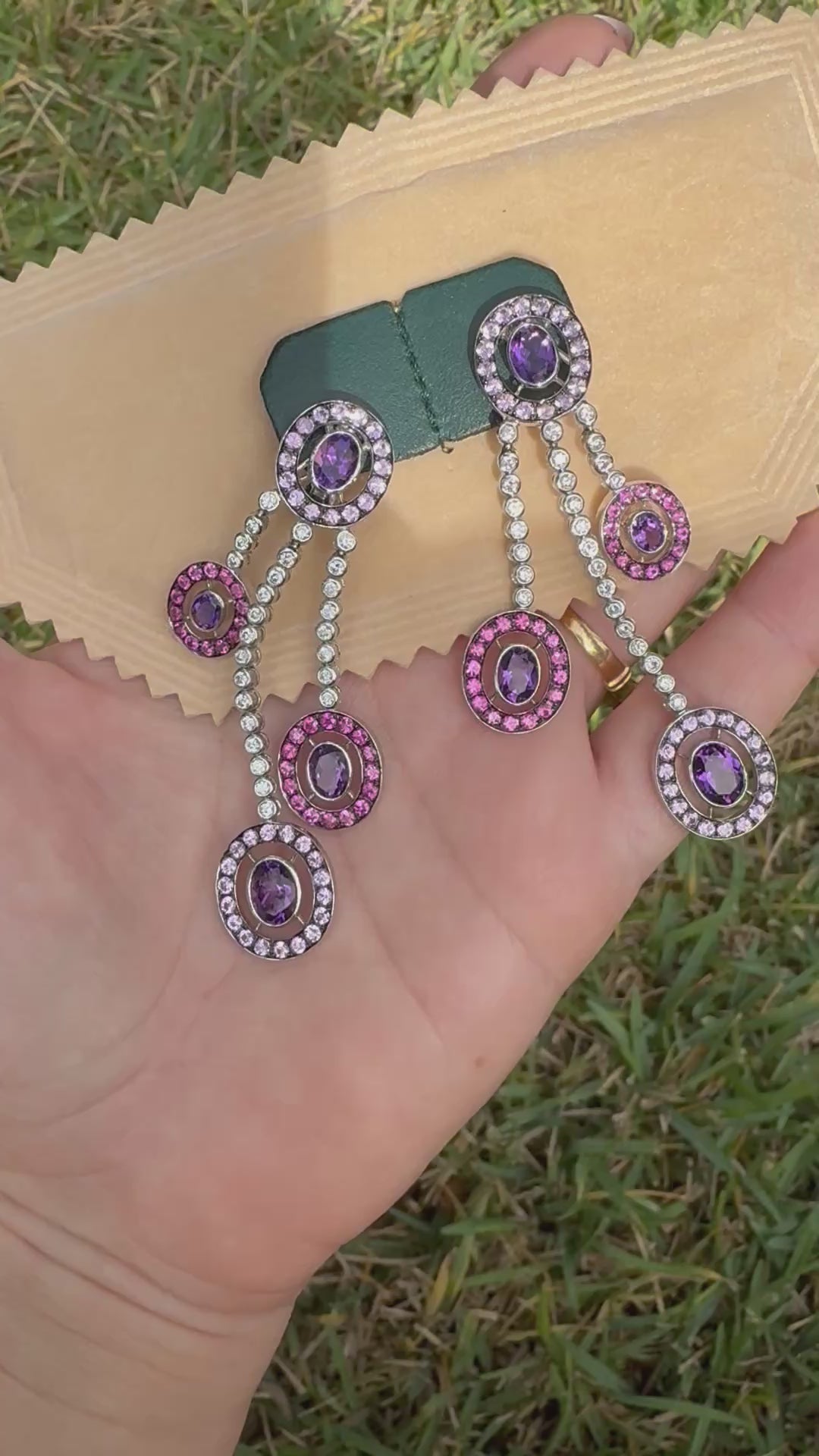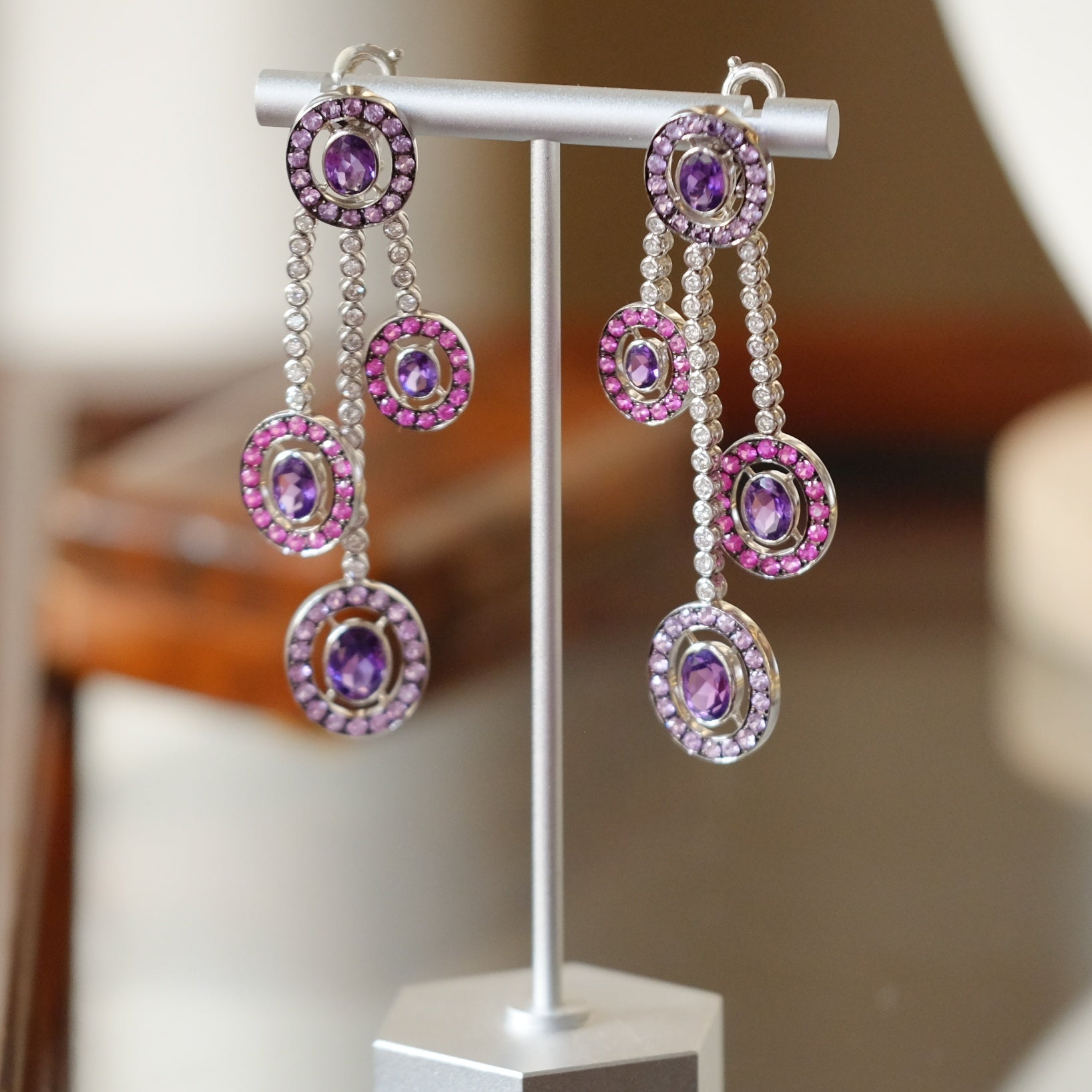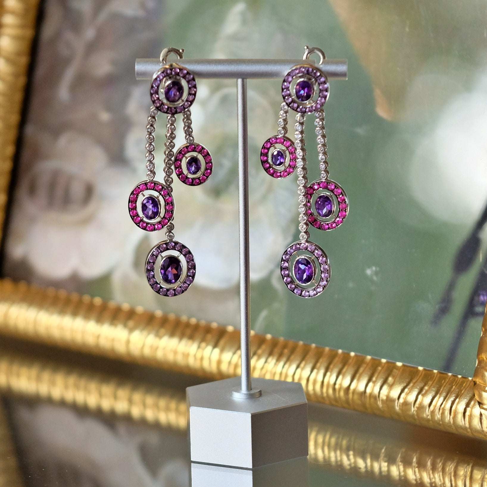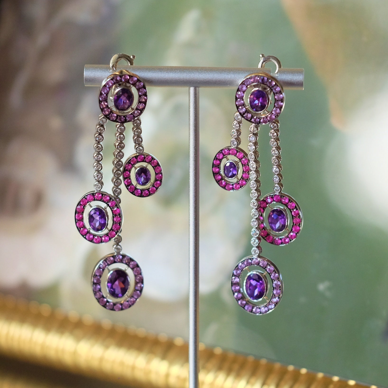 These exquisite vintage earrings showcase a harmonious blend of sparkling diamonds, rich amethysts, and delicate pink topaz, all set in luxurious 18k white gold. Expertly crafted, they offer timeless elegance and a refined color palette that complements both formal and everyday attire. Perfect for collectors and connoisseurs seeking a sophisticated statement piece with enduring value.