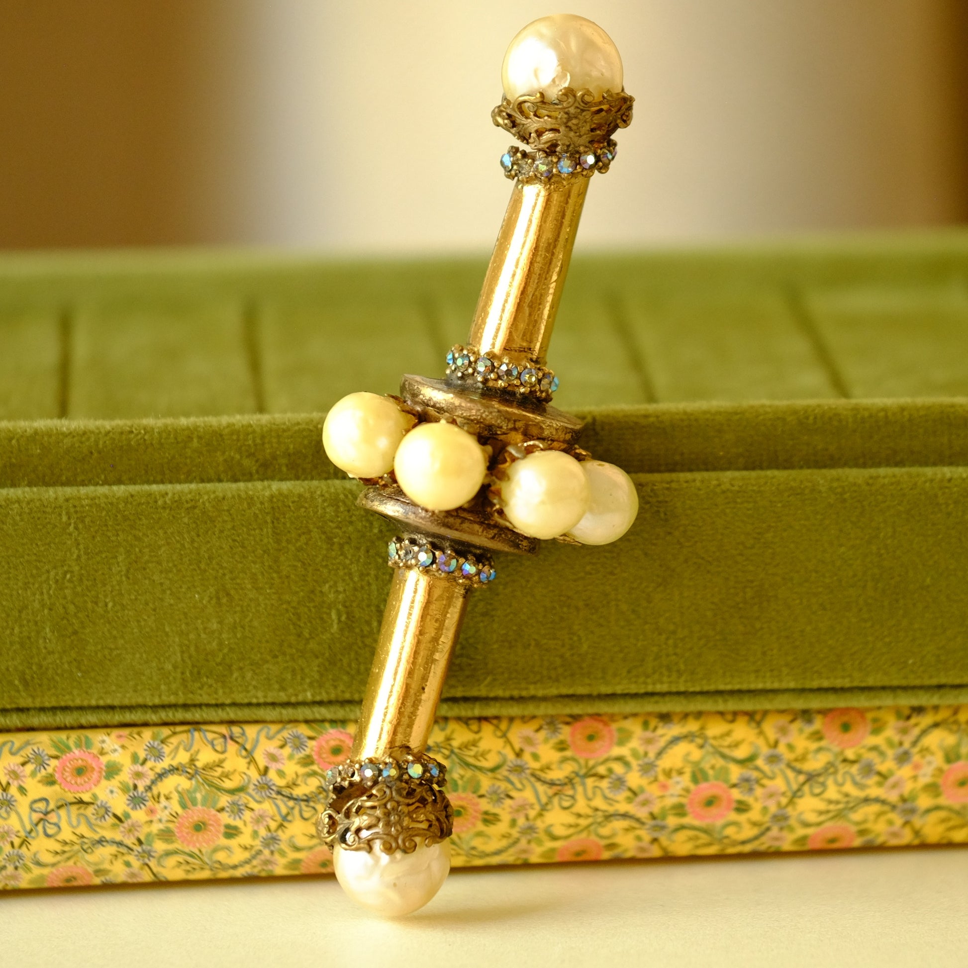 This vintage French bar pin from the 1980s offers a timeless accessory with classic design. Its elegant simplicity makes it a versatile piece, perfect for adding a subtle touch of sophistication to any outfit. Crafted with attention to detail, it reflects the style and quality of its era.