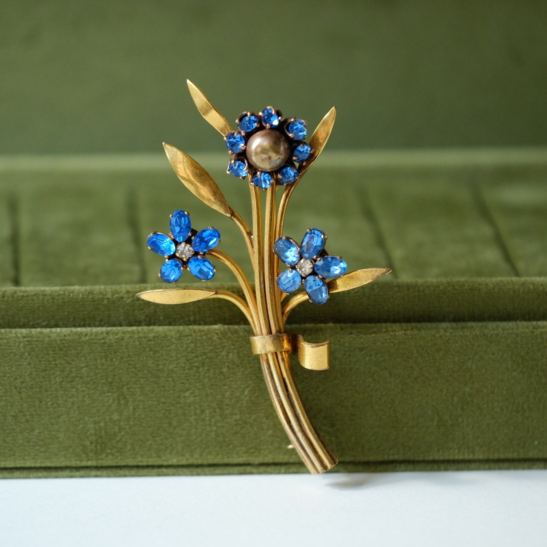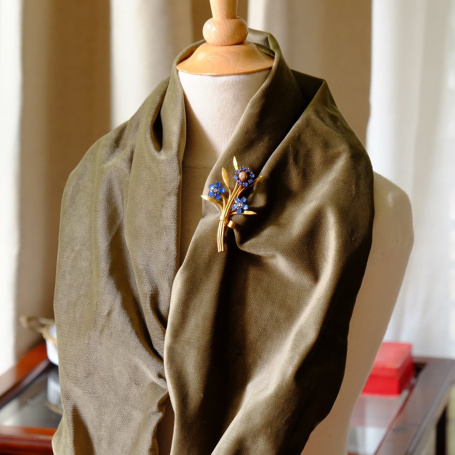 This vintage French flower brooch from the 1960s features a classic trombone clasp, ensuring secure wear. Its timeless floral design adds a subtle touch of elegance to any outfit, making it a charming accessory for collectors and vintage jewelry enthusiasts alike.