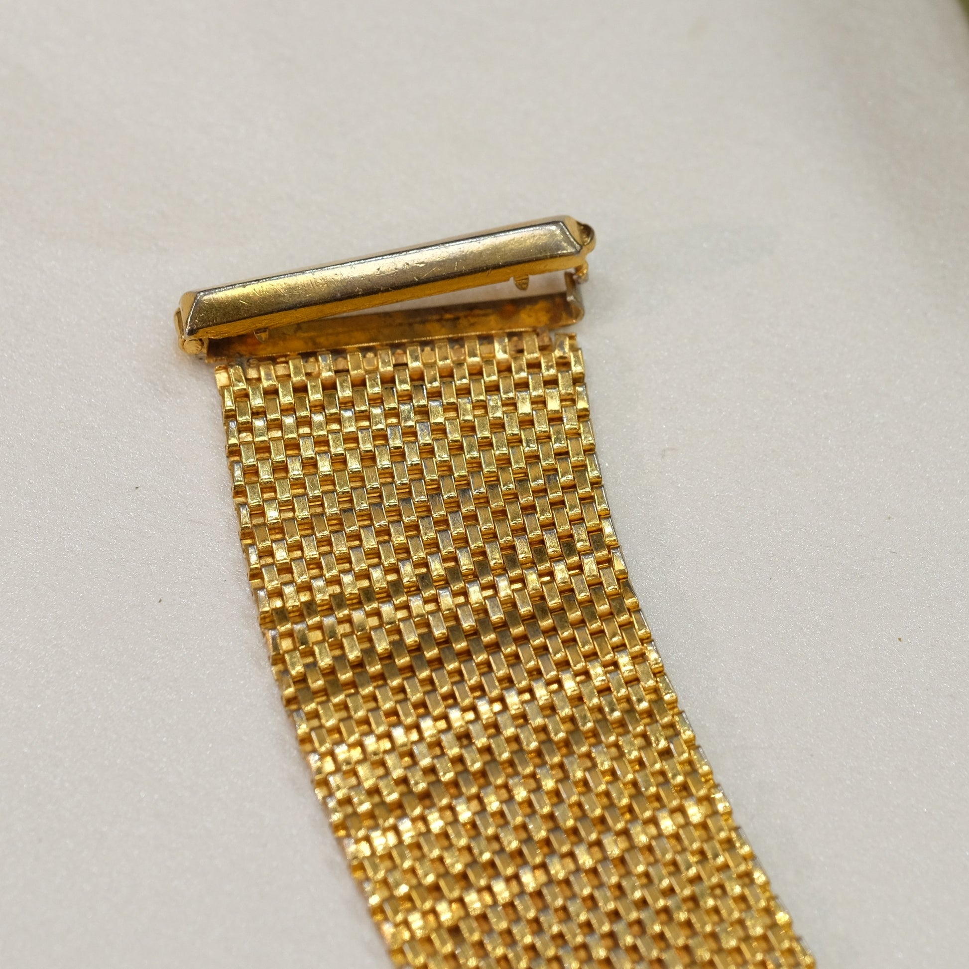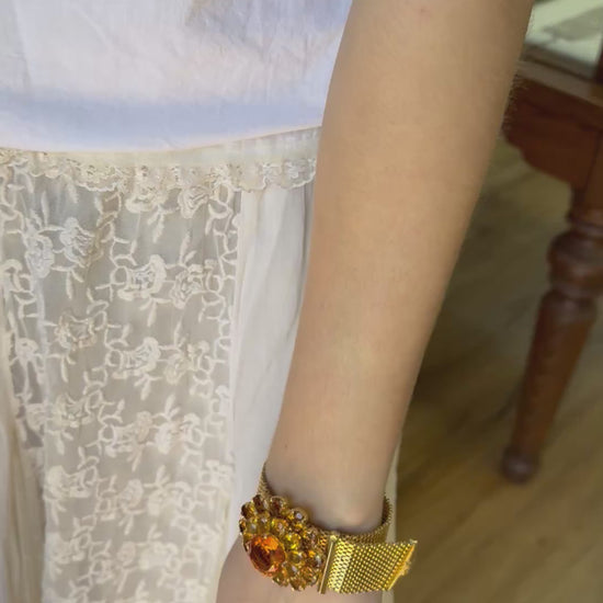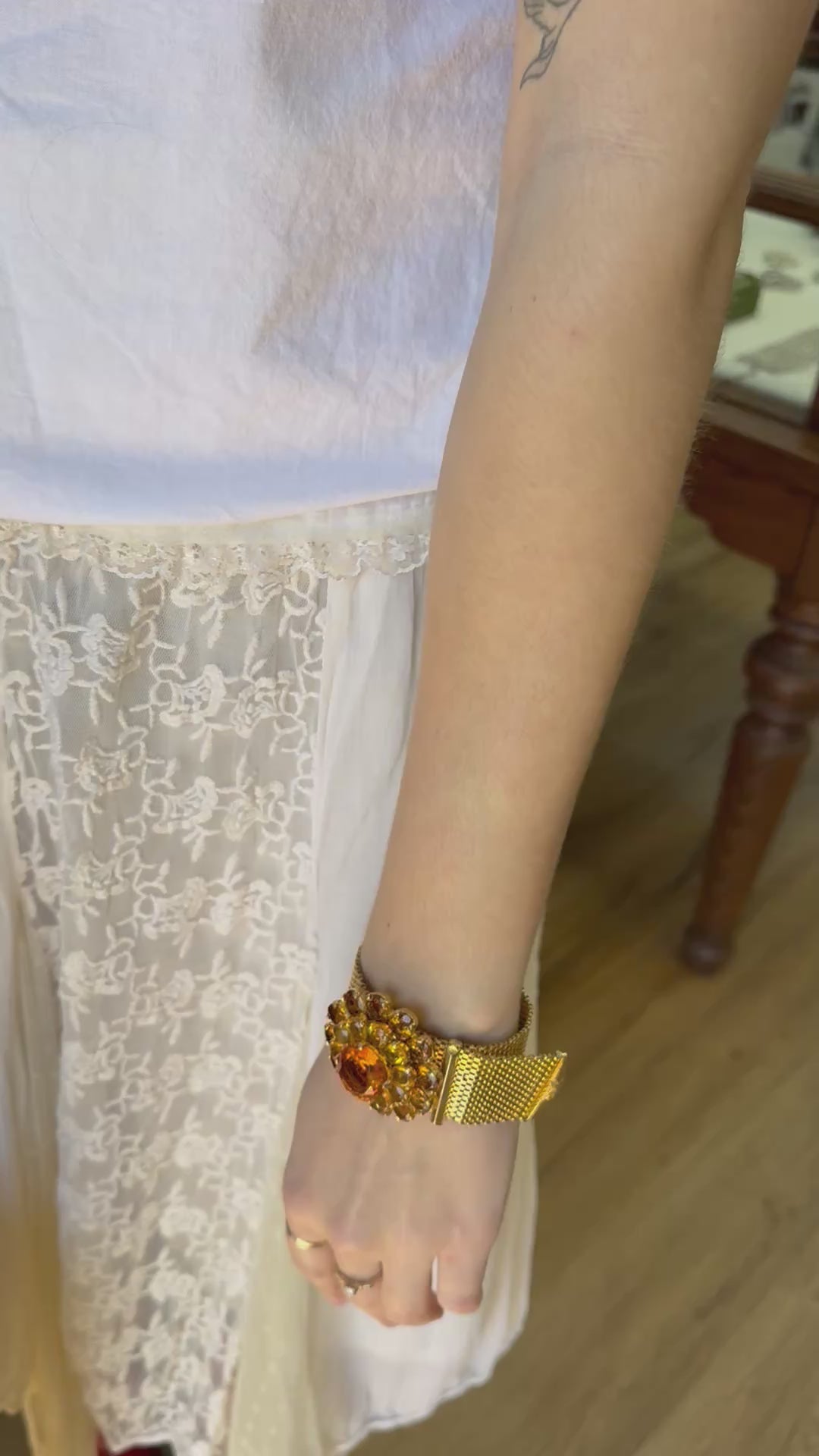 This striking 1940s Mazer bracelet exemplifies the bold aesthetic of the era with its substantial width and vintage appeal. Crafted during the height of Art Deco influence, this retro piece features the quality construction Mazer was known for, making it a standout addition to any vintage jewelry collection. The wide design offers substantial presence on the wrist while maintaining the elegance characteristic of mid-century costume jewelry. Perfect for collectors seeking authentic vintage pieces or anyone drawn to the glamorous style of the 1940s.