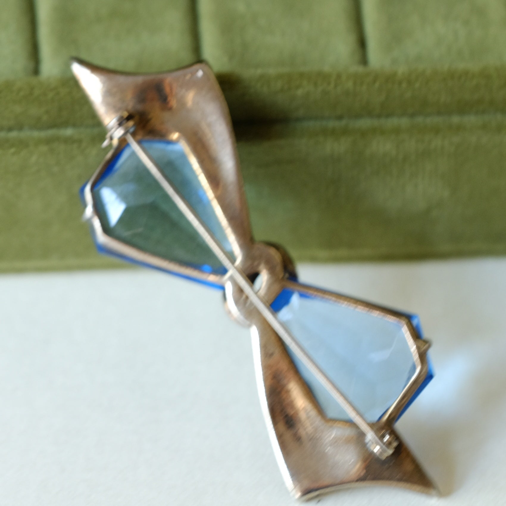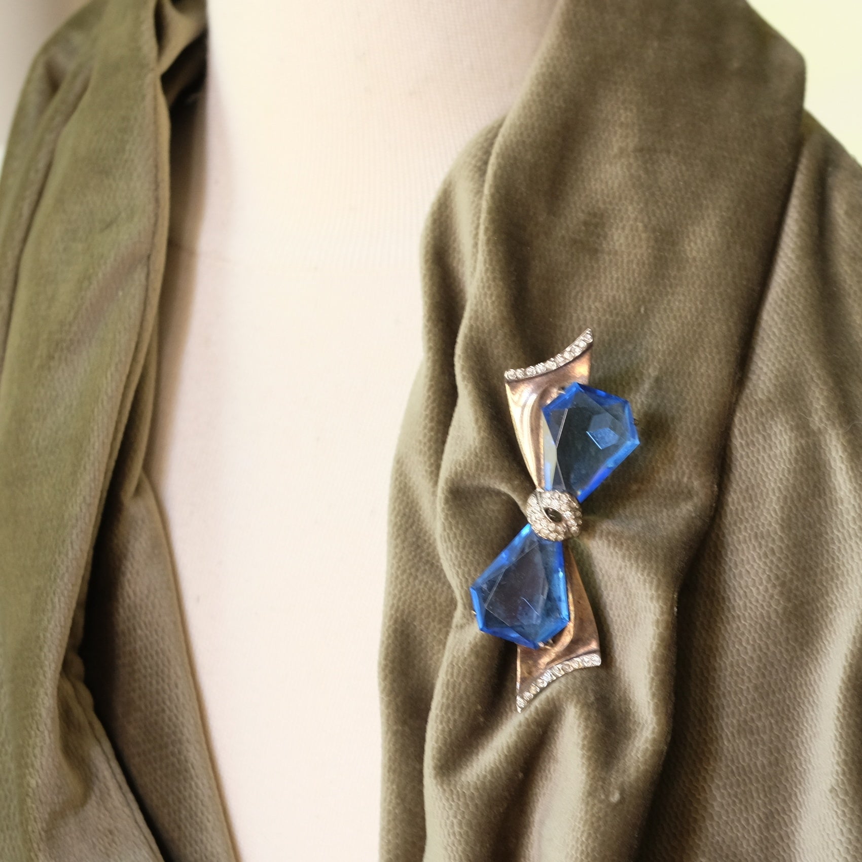 Vintage Retro Sterling Bow brooch with Blue Glass 1940s