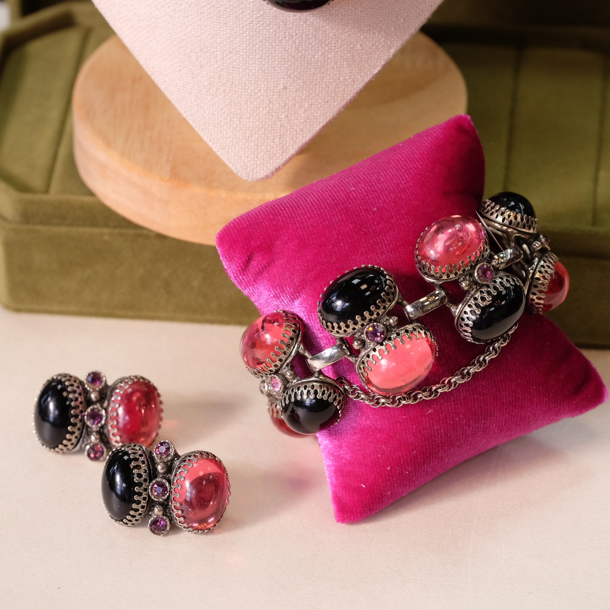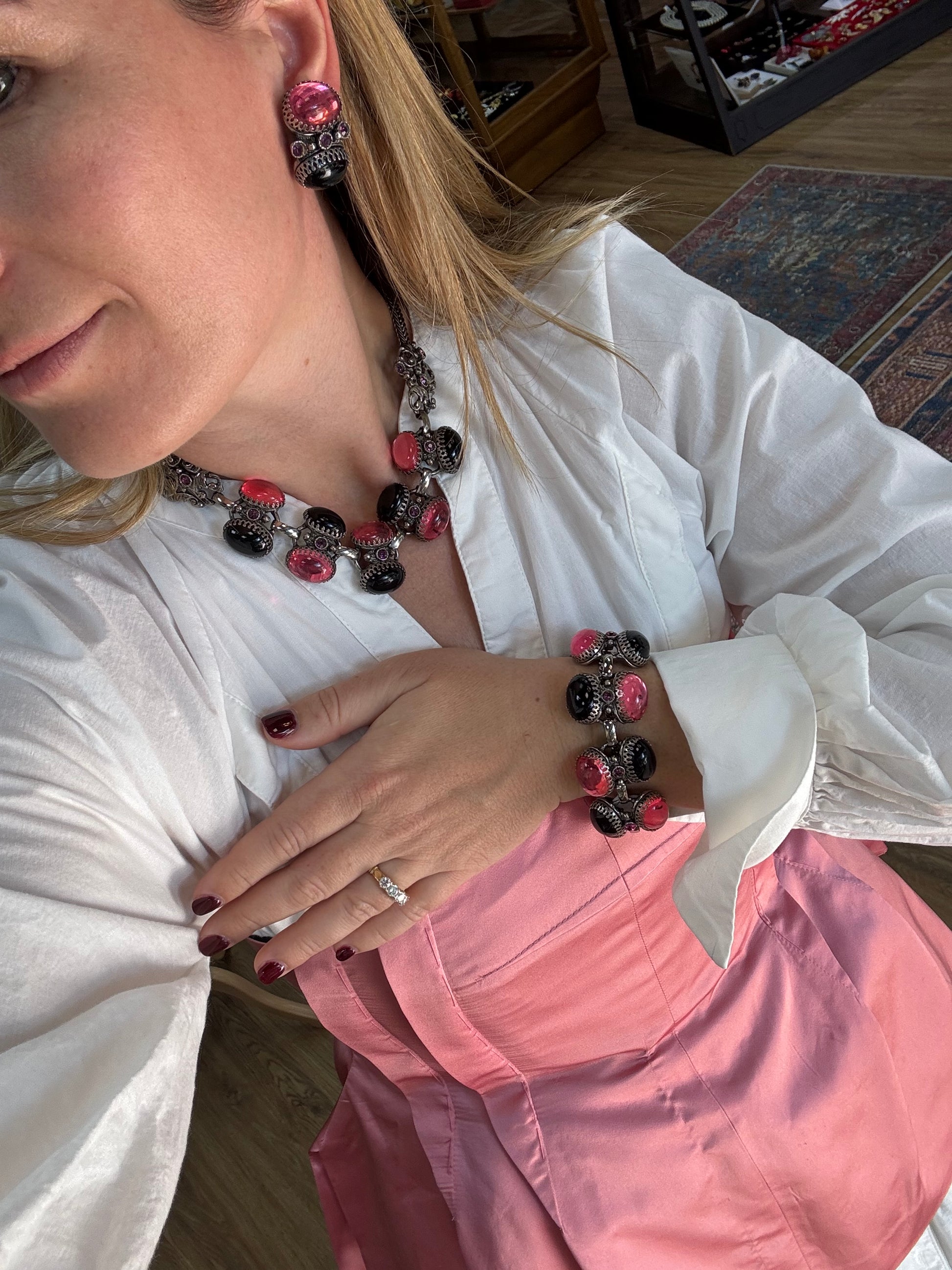 This stunning three-piece Selro set captures the glamour of 1960s costume jewelry design. The coordinated necklace, bracelet, and earrings feature the distinctive aesthetic Selro was known for—bold, eye-catching pieces with intricate detailing. Perfect for collectors of vintage jewelry or anyone seeking authentic mid-century accessories with character and presence. A timeless addition to any jewelry collection.