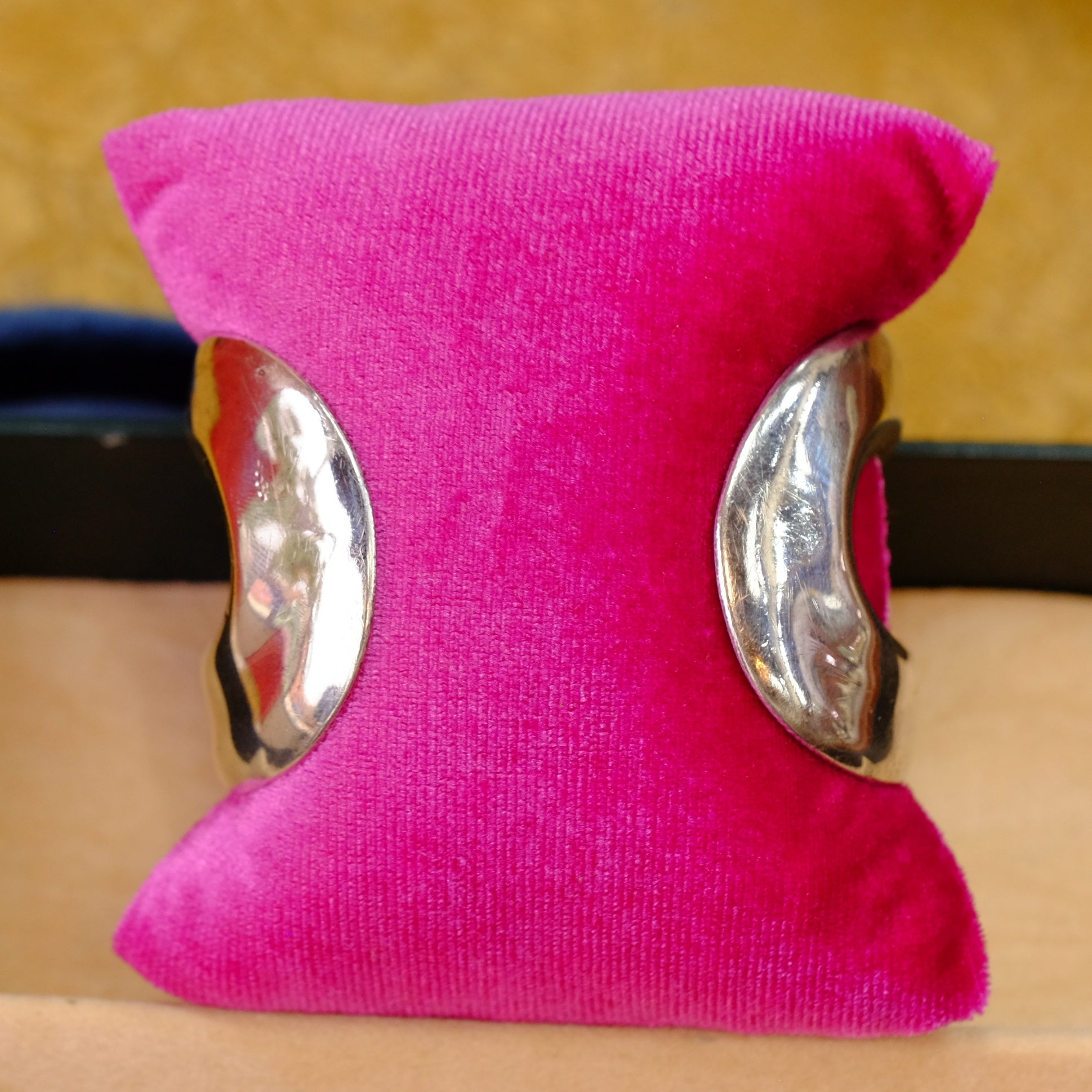 This elegant vintage silver cuff slide hails from Mexico, showcasing authentic craftsmanship from a bygone era. Featuring intricate detailing characteristic of traditional Mexican silverwork, this piece adds timeless sophistication to any collection. Perfect for collectors of genuine vintage jewelry or those seeking a distinctive accessory with cultural heritage and artisanal charm.