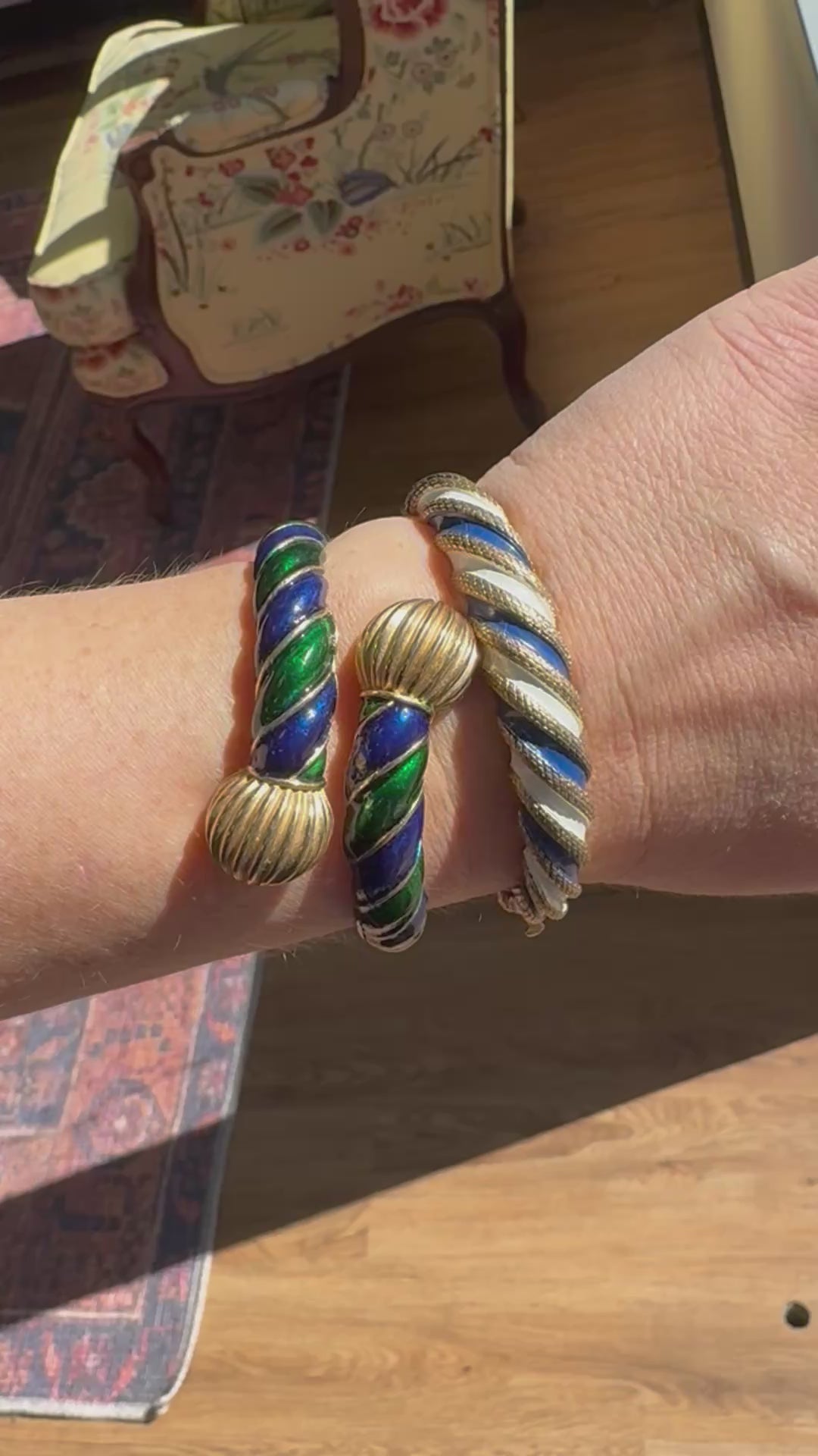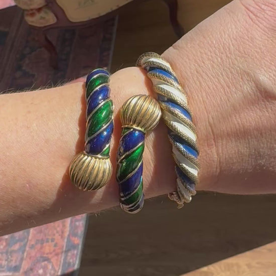 This Vintage Trifari Enamel Bracelet from the 1960s showcases classic mid-century design with bold enamel accents. Crafted by the renowned Trifari brand, it offers timeless style and durable construction. Its distinctive colors and vintage charm make it a versatile accessory perfect for adding a touch of retro elegance to any outfit.